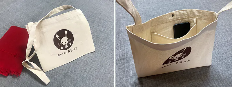 農園カフェ ラビットのオリジナルサコッシュが、出来上がってきました。生成のキャンパス地も、ほどほどに厚みがあっていい感じです。内ポケットがついているのも嬉しい!