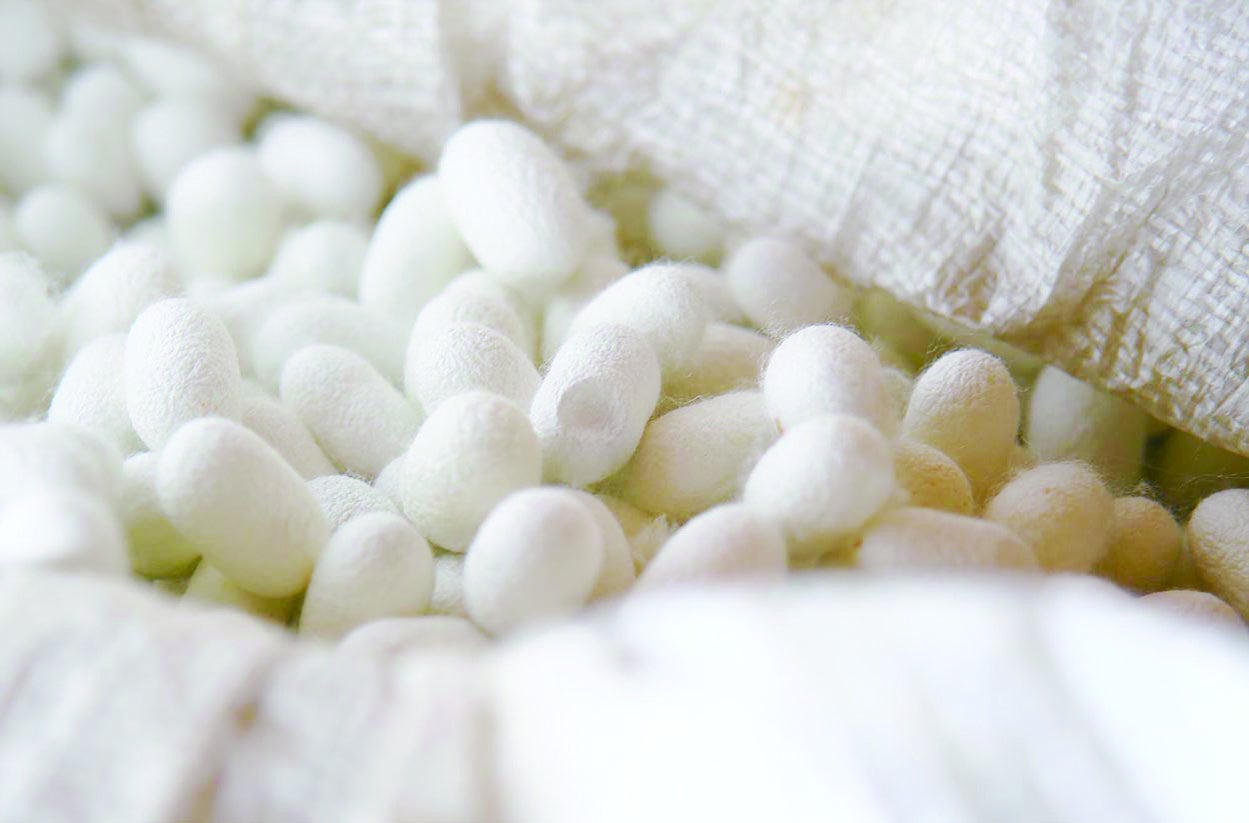 繭玉に含まれる「セリシン」という成分は、人肌の持つうるおい成分アミノ酸に極めて近いタンパク質で、保湿性に非常に優れています。人肌の組成に近いため、人間の肌に素早く浸透しお肌の潤いを保ってくれます。また、セリシンは高い保湿性能のほかにも、抗酸化作用や紫外線吸収機能もあわせ持ち、人肌には正に理想的な天然保湿成分と言えます。