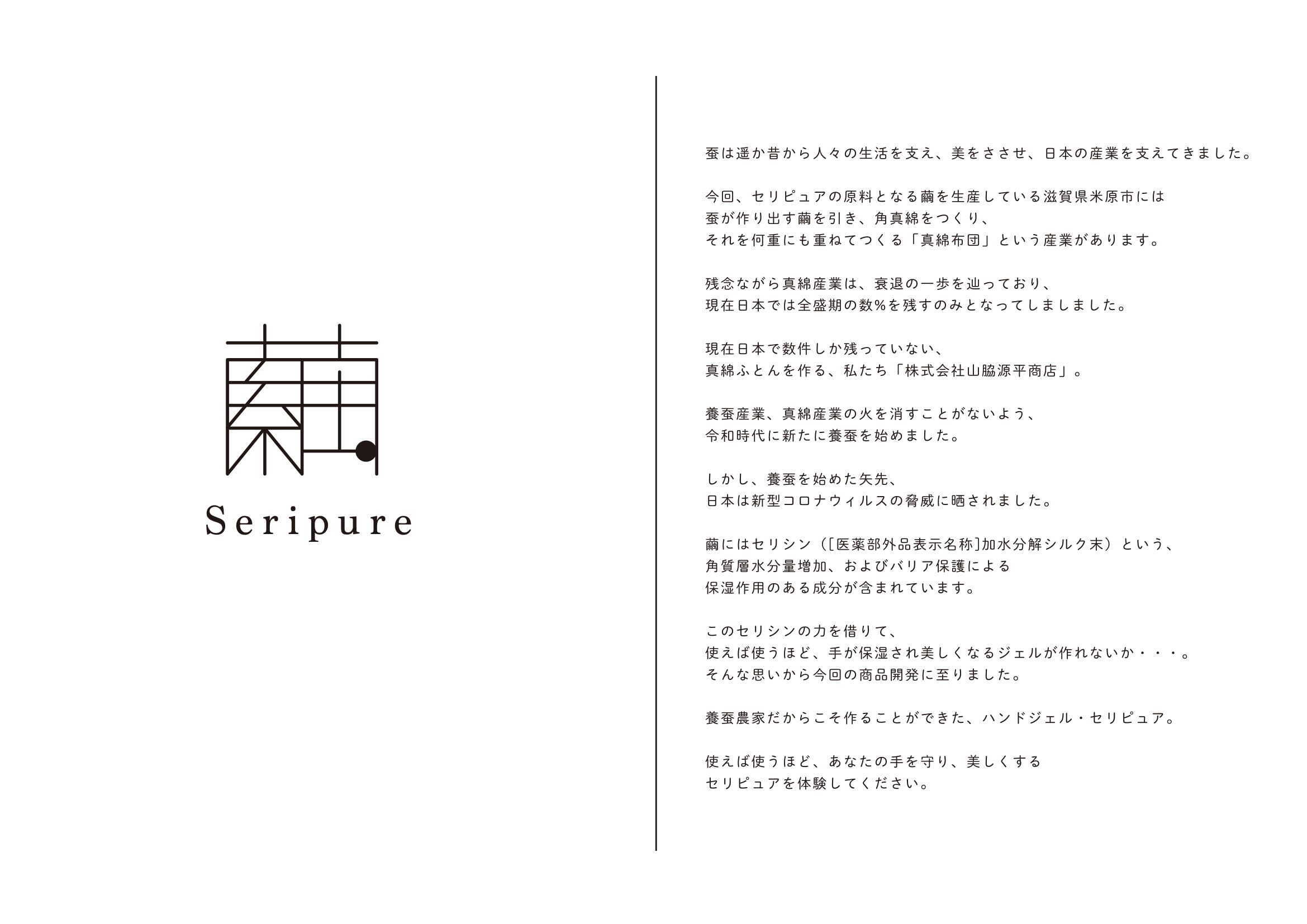 ▲「セリピュアハンドジェル」のブランドロゴ&ストーリー。「繭」の漢字をベースとした記号的なデザイン。