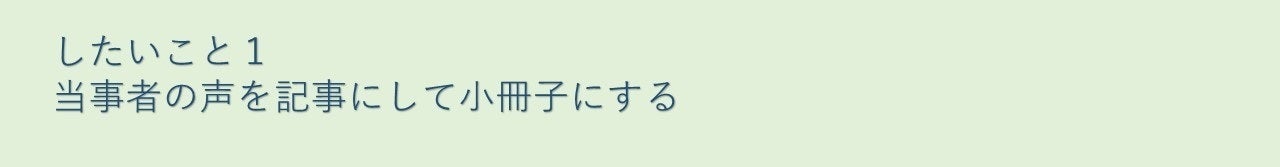 高次脳機能障害のある方は、それぞれが、それぞれの所属する当事者会などで、ご自身の経験をお話することが多いと思いますが、それらをきちんと集積していくことが大事だと感じています。なぜなら、ひとりひとりの困りごとは、それぞれ細かい点は違えども、何かしらの共通点があったり、人の解決策を見てかなりのヒントになったりするからです。当事者会の場所にいた人だけでなく、ネットにつながっている人皆にヒントとなる元が届くよう、集めていきます。