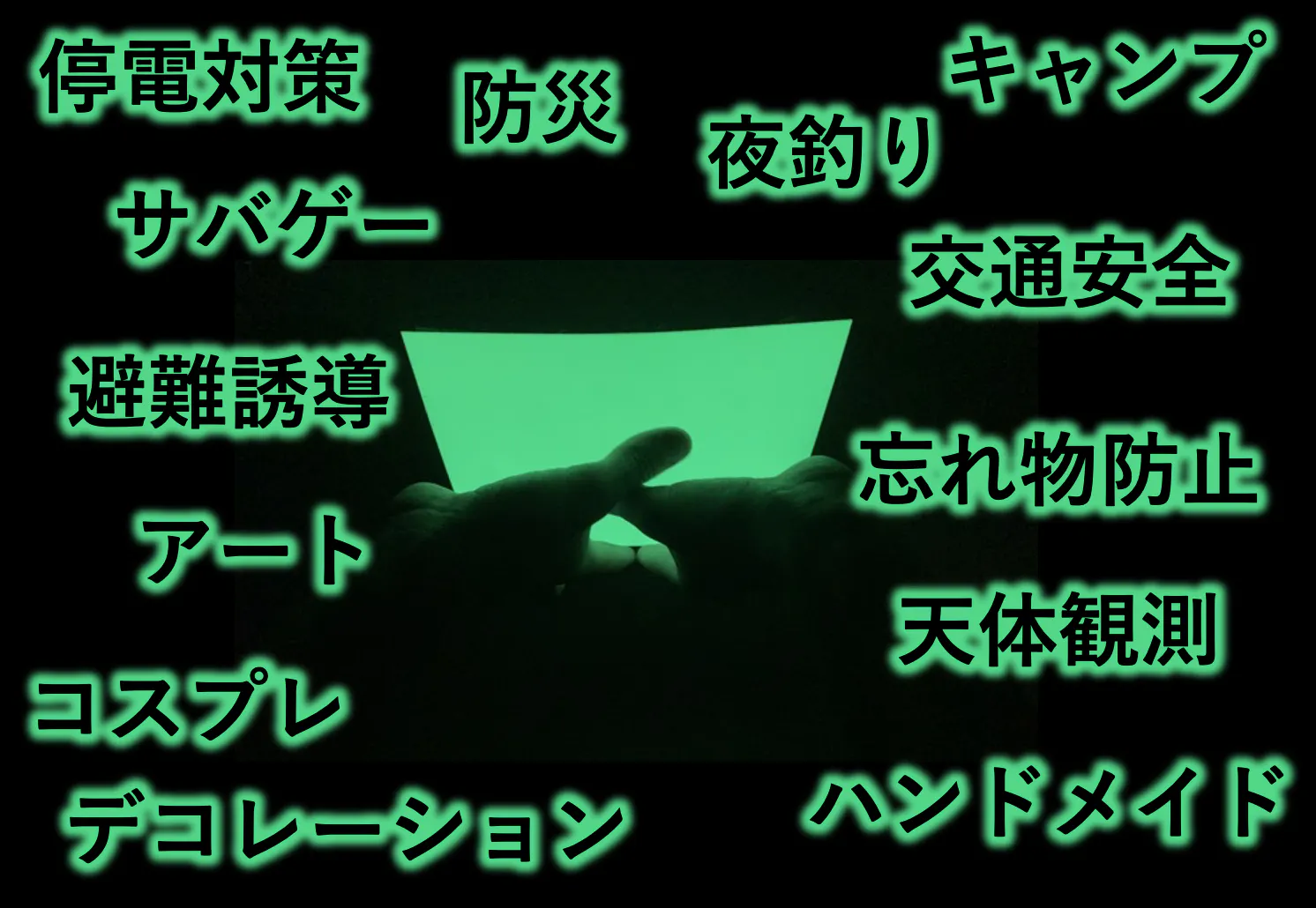 ※こちらのプロダクトはグリーン発光のシートとは異なり簡易包装となります。また、最長発光時間をはじめとして各種スペックがグリーン発光のシートとは異なるためご注意ください。詳細につきましては本ページ下部の「製品情報」よりご確認いただけます。