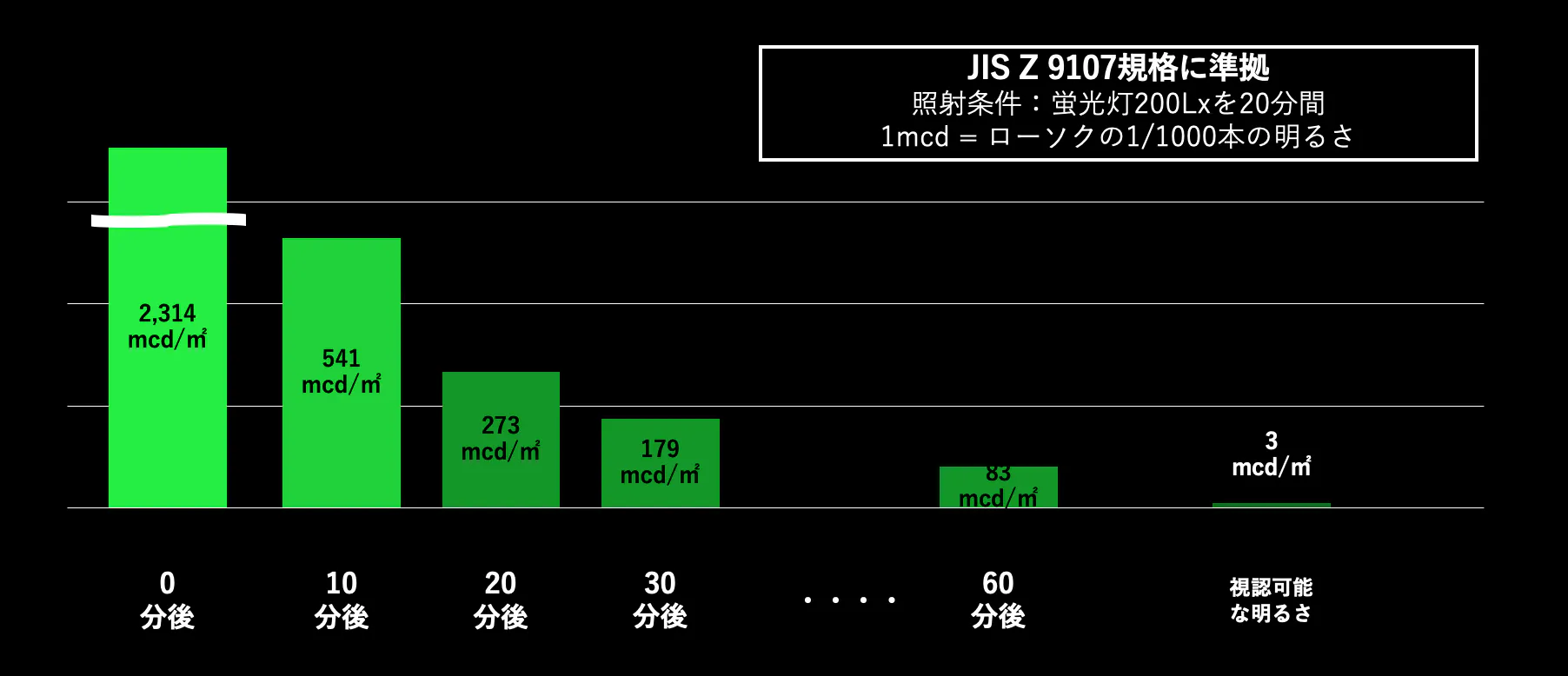 ※発光の明るさは一定ではなく、時間の経過と共に徐々に暗くなります。JIS Z 9107規格(安全標識の性能の分類、性能基準及び試験方法)に準拠しており完全に蓄光した状態からでは、12時間後でも暗所にて薄らと3mcd/㎡以上で発光し視認性をサポートします。