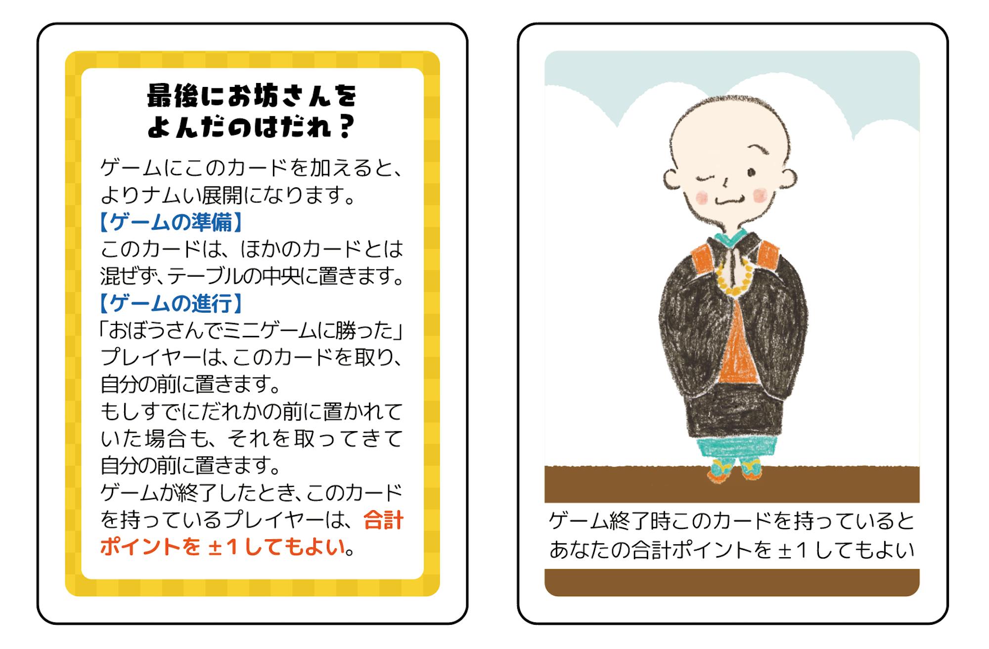 おぼうさんカードでミニゲームを最後に勝ったプレイヤーは、「最後にお坊さんをよんだのはだれ?カード」を自分の前に置きます。このカードを持ったまますべてのミニゲームが終了すると、勝利者判定をするとき優位に働きます。