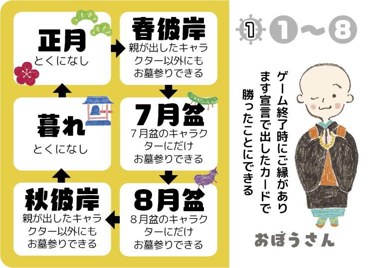 ▽【ラウンドごとの特色:春彼岸ラウンド、秋彼岸ラウンドはどこにでも「お墓参り」「ビンジョー参り」ができる。キャラクターのペア概念がなくなる。7月盆ラウンド、8月盆ラウンドはお墓参り候補が設定されており、カードを持っているならば出さなければならない】