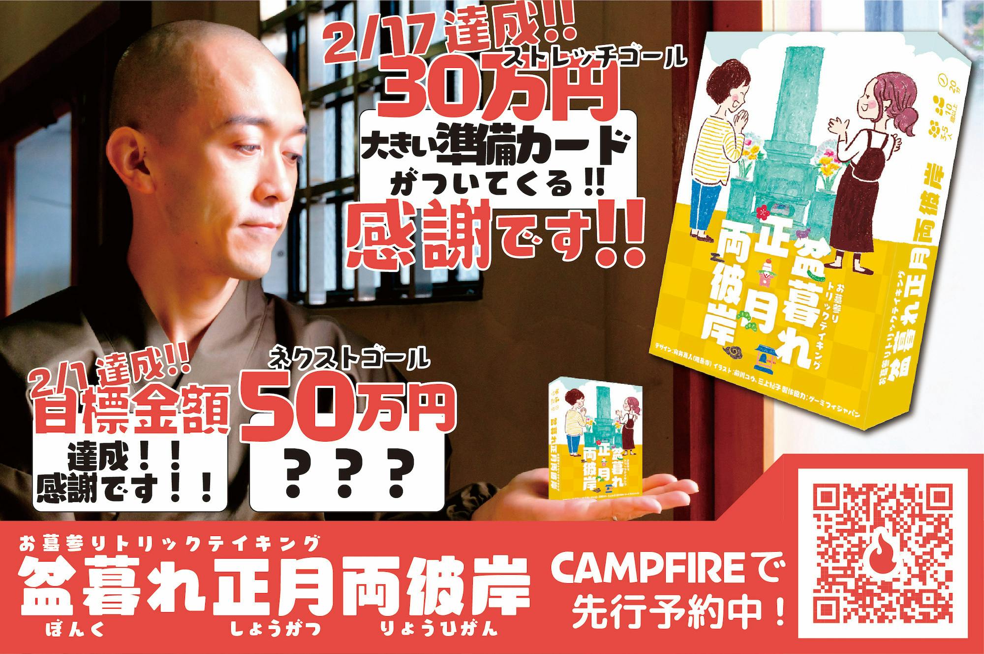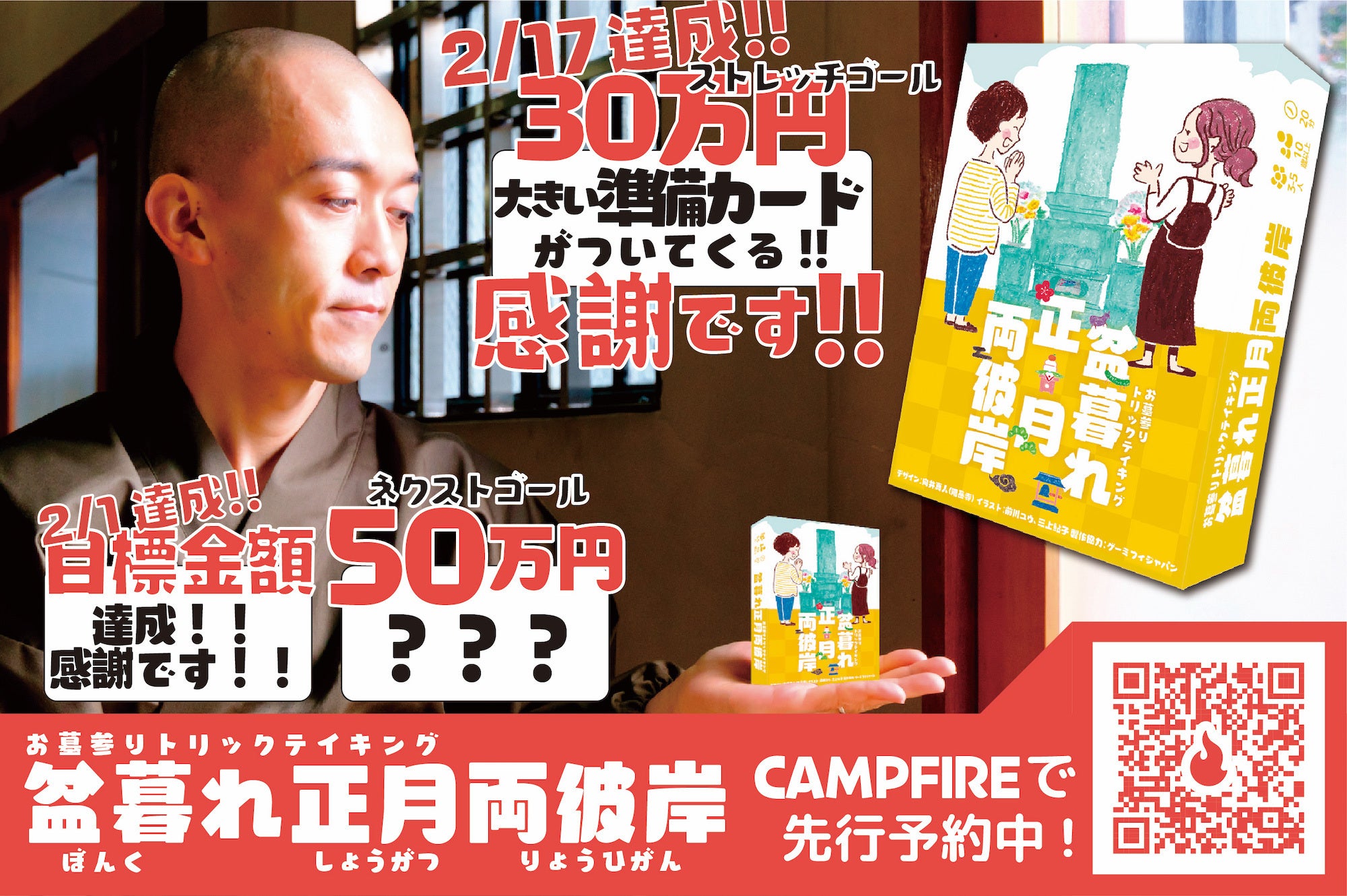 さきほどストレッチゴール [[30万円]]を達成いたしました!多くの方に、単品プラン、説明書プラン、カレンダーつきやWAになって語ろう新版がついてくるプラン、お寺ボドゲプラン、ウェブで遊びましょうプラン。ご支援をたまわりましたおかげさまでございます。本当にありがとうございます。