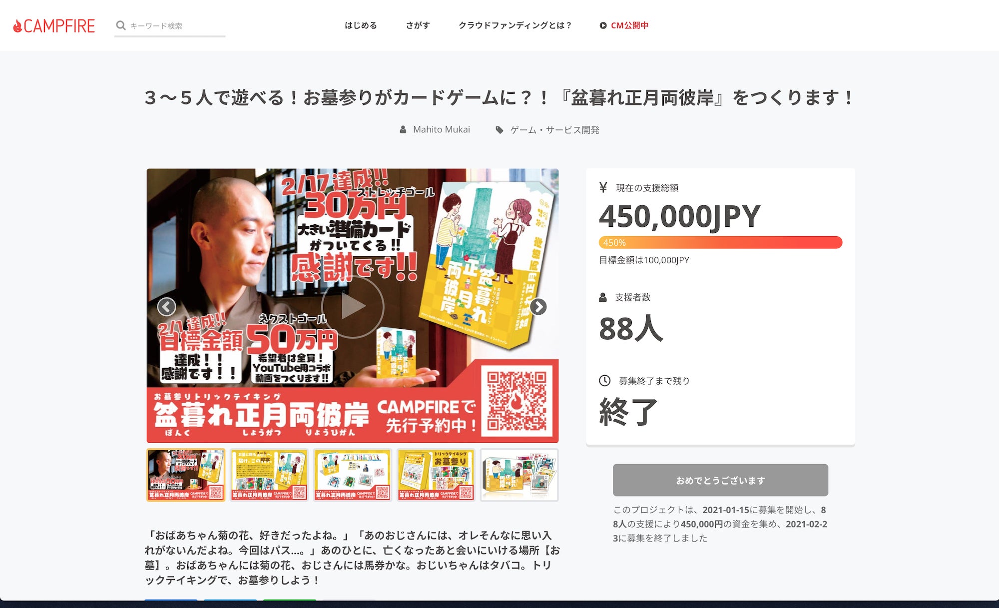 おかげさまをもちまして、クラウドファンディングの当プロジェクト『3〜5人で遊べる!お墓参りがカードゲームに?!『盆暮れ正月両彼岸』をつくります!』。