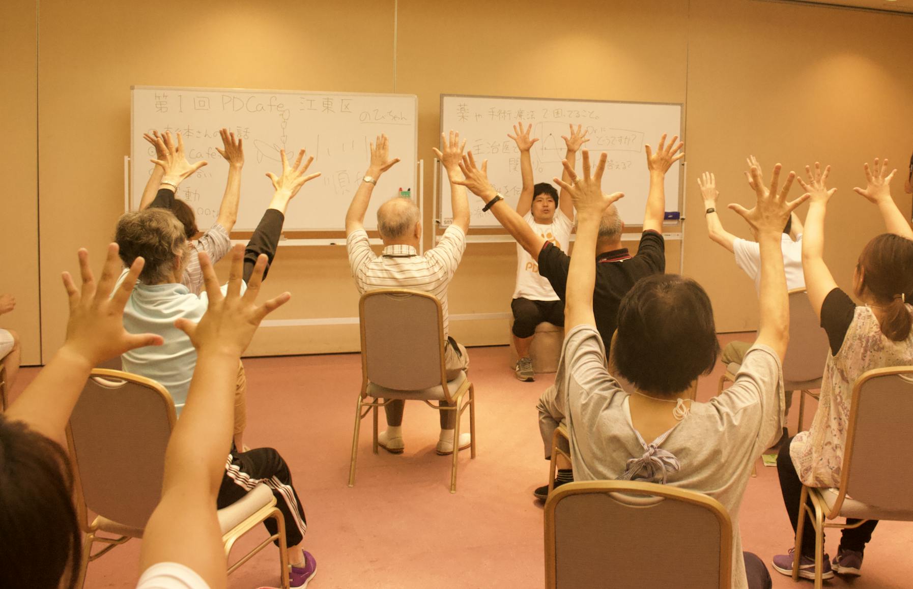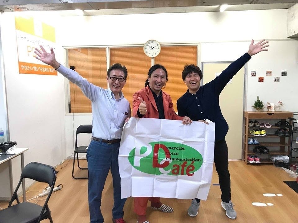 PD Cafeはパーキンソン病の方のための運動継続プログラムです。PD Cafe代表の小川順也は理学療法士として2015年まで国立精神・神経医療研究センター病院で働いていました。パーキンソン病には運動療法が効果的であるが、運動症状が軽度の方が継続して続けることが難しい現状があったため病院を退職してPD Cafeを全国に広げている。運動だけではなく、つながりもとても大事です。
