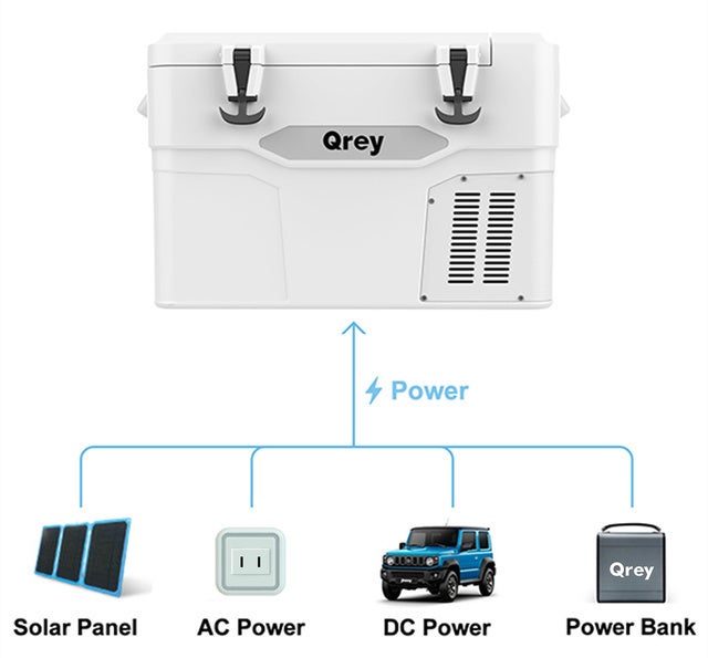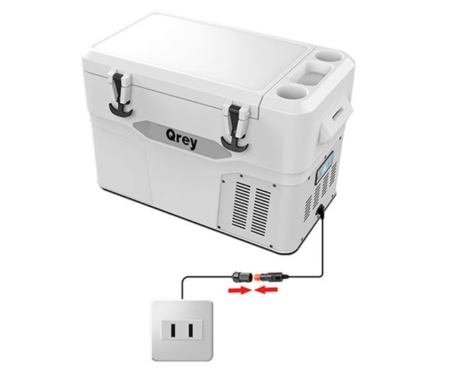 【Qrey 42L】はプライベート冷蔵庫として使える一般家庭用100Vコンセントと、車のバッテリーから給電できる12V/24Vのシガーソケットのコンセントを兼備しています。