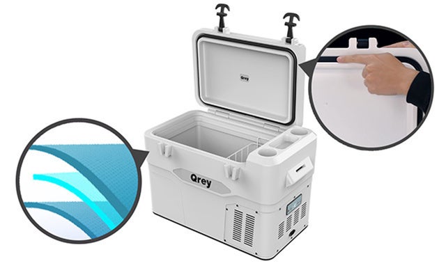 省エネと保冷効果を高めるため、【Qrey 42L】のボディは断熱シートと冷却ジェルの3層構造。気密性を高めるため、蓋のゴムパッキンも分厚い造りです。