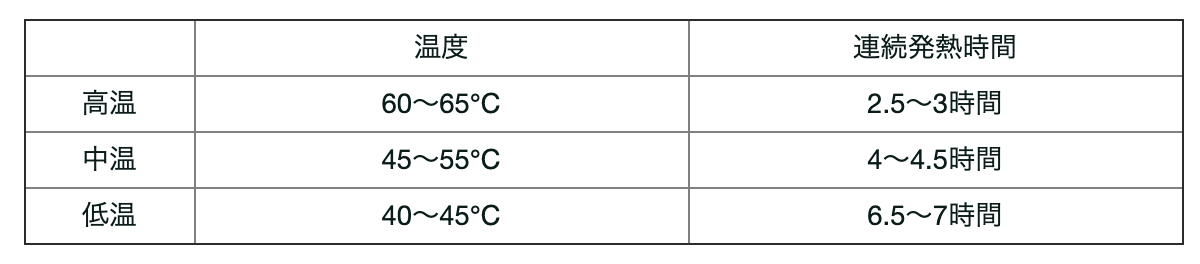 発熱温度:低温 40〜45℃(6.5〜7時間)、中温 45〜55℃(4〜4.5時間)、高温 60〜65℃(2.5〜3時間)