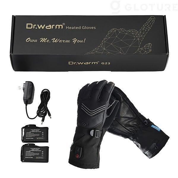 同梱物:Dr. Warm 発熱グローブ、リチウムイオン電池×2、デュアルポート充電器、説明書(英語)