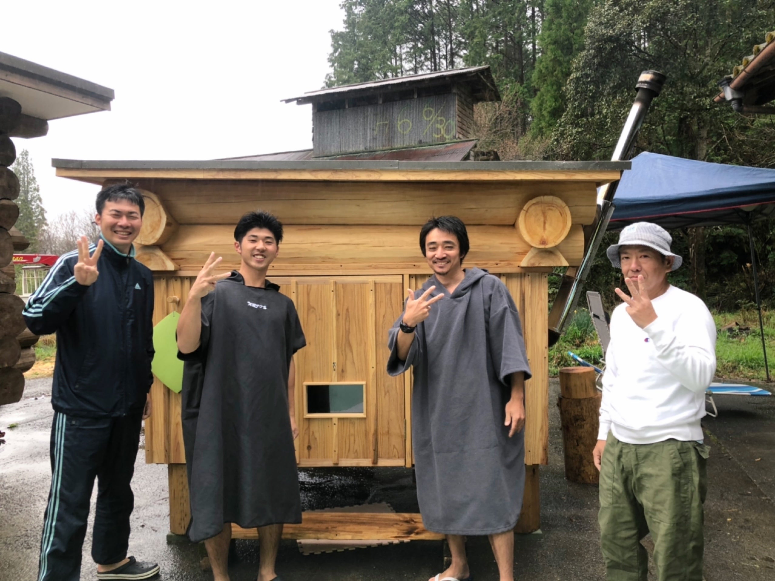 北郷の自宅につくってある日比野さんのサウナを訪問してきました!!!!ソトラボの伊藤さんからサウナつくった人知ってるから今度紹介するね。と言ってもらってて丁度Facebookを通してクラウドファンディングを支援してくださった美郷町在住の川西さんから『日比野さんのサウナを体験してほしい!個人的にはととのいを教えてほしい』という依頼があったので是非是非という形になり勉強、体験してきました!!!!!これがログビルダー日比野さんがつくったサウナ小屋です!!!!!!かっこいい!!!!!!!!!!!!!!全部ログでつくってない理由はユニック車で運べる仕様にしたかららしいです。中は杉の香りが充満してて最高です。。。。。サイズは1,8×1,3 高さ1,4メートル2人までしか入れない完全プライベートサウナ小屋。温度も100度まで上昇、ガッツリ温まります!!!!!!!!ととのいまで導くの得意と豪語した結果は川西さんをしっかり【ととのい】まで導きました!!!!!いやーーーー写真から幸福感ダダ漏れですね、、、、、、ナイススマイル!!!!!!!!!日比野さんと伊藤さんも雨の中とは、思わせないこの表情!!!!!!やっぱサウナって最高です!!!!!!!!!!!!(体験してサウナトレーラーの設計見直して少し変えました)