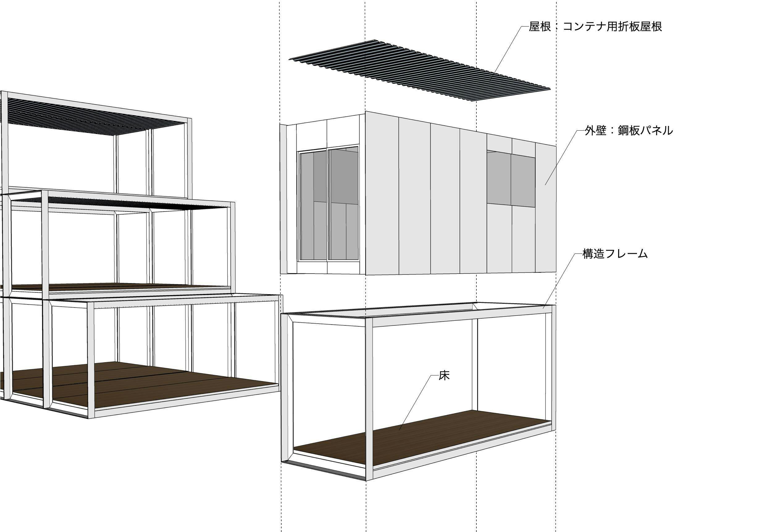 屋根葺材:コンテナ用金属折板屋根、一部透明ポリカーボネート折板・防水仕様積雪考慮