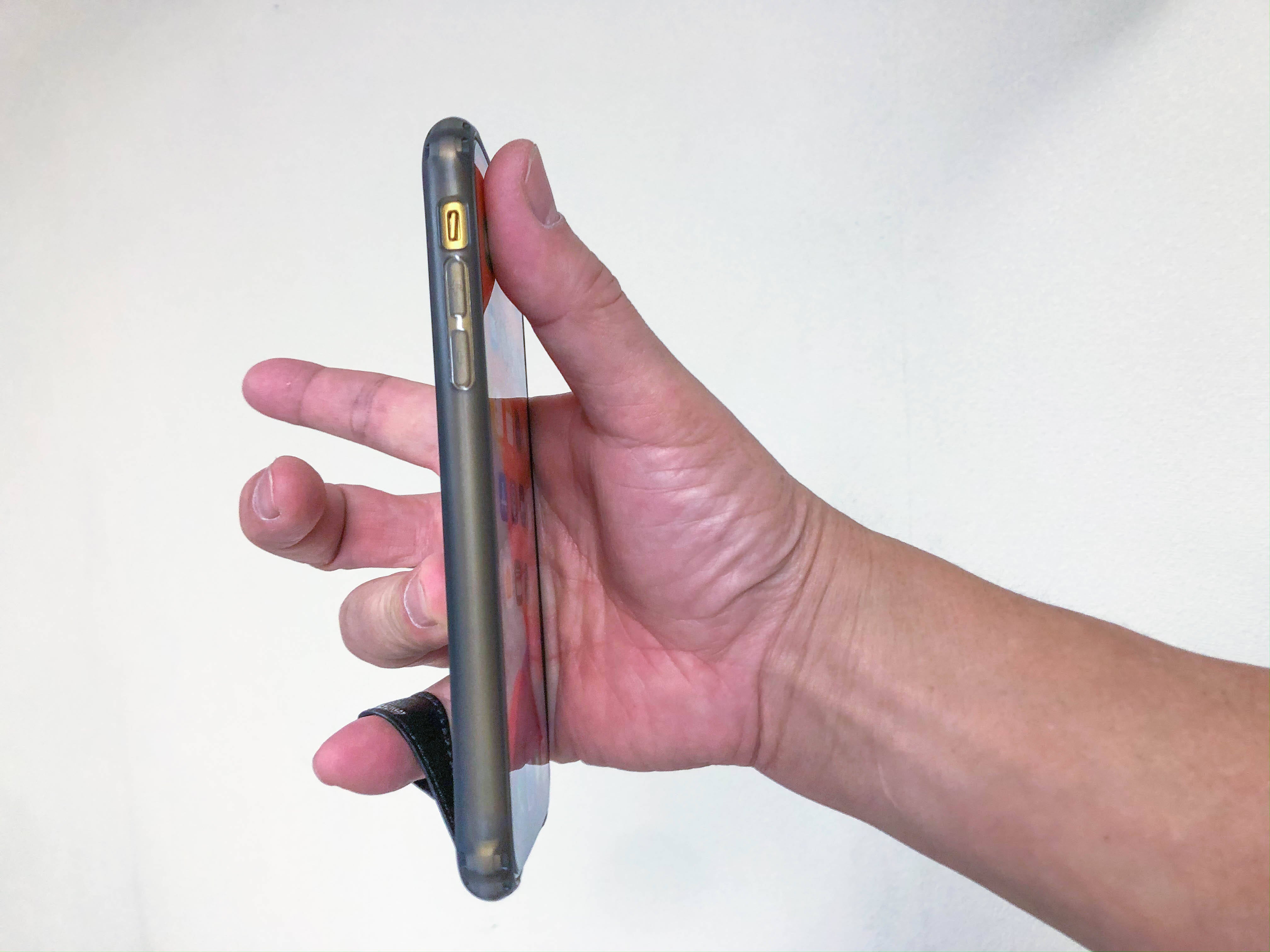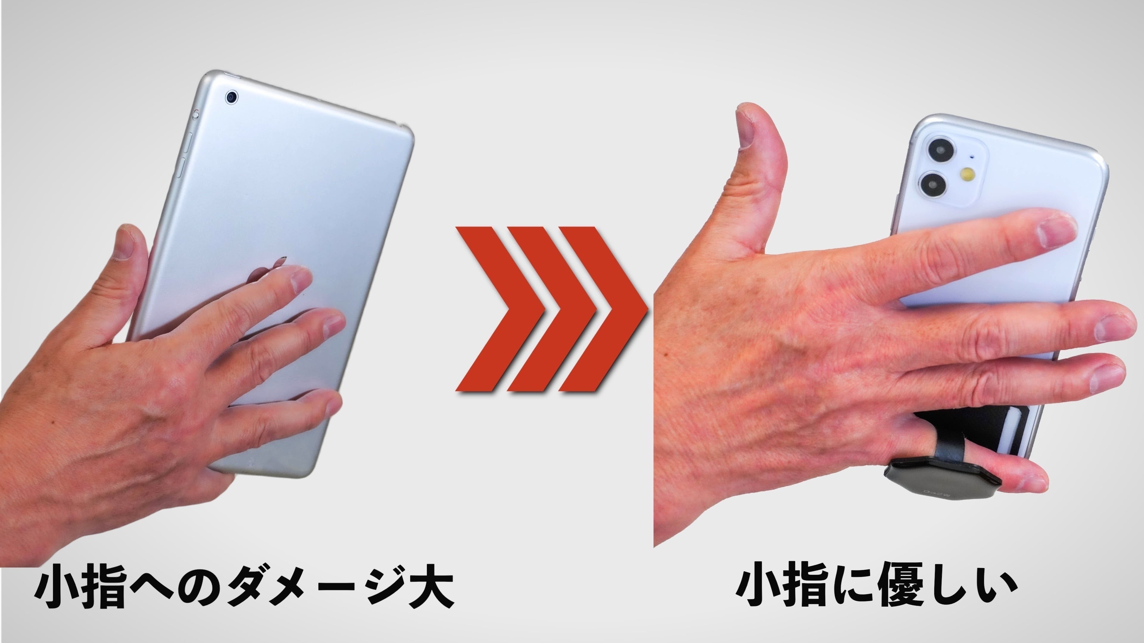 従来のスマホリングは、人差し指で握って持っていました。人差し指はお腹と連動しているので、人差し指で握って持つとお腹に力が入り姿勢が丸まりやすいのです。