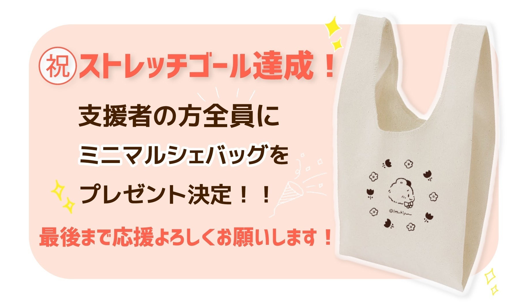 2021/03/26 19:16「大きなくまちゃんぬいぐるみ化プロジェクト」をご覧くださりありがとうございます。CAMPFIRE Creationスタッフです。先日設定した300%達成のストレッチゴールを本日、達成いたしました!!!沢山の応援、本当にありがとうございます!!ストレッチゴールの達成記念として、プロジェクトを支援してくださった皆さまに、いつきゆうさんオリジナルデザインの「ミニマルシェバッグ」をプレゼントいたします!!小さめのコンビニ袋サイズで、ちょっとしたお買い物でのエコバッグとして便利なバッグです!まだご支援をお悩み中の方も、この機会にご検討ください。プロジェクトは今週の日曜日、3月28日 23:59まで!最後までどうぞよろしくお願いいたします! もっと見る