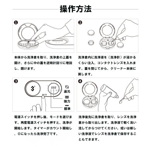 強力洗浄モード使用後、直接レンズを目につけるのを禁止!強力洗浄過程で、微電流と洗浄液が電解により次亜塩素酸が生成します。次亜塩素酸は目に一定の刺激作用があり、目の健康には影響ありませんが、以下の操作をお勧めします。