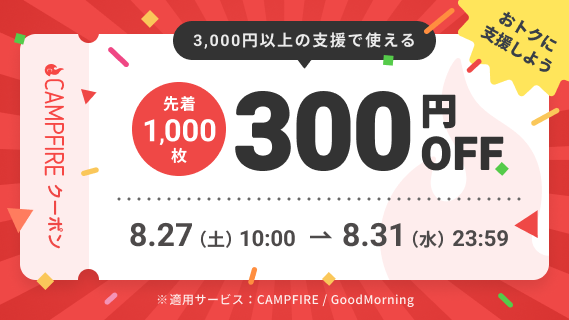 募集終了まで【残り2日】▶CAMPFIREで使える【先着】1,000名さま限定!◉300円クーポン◉プレゼント‼
