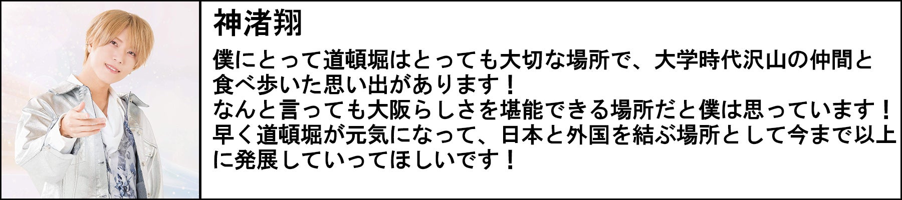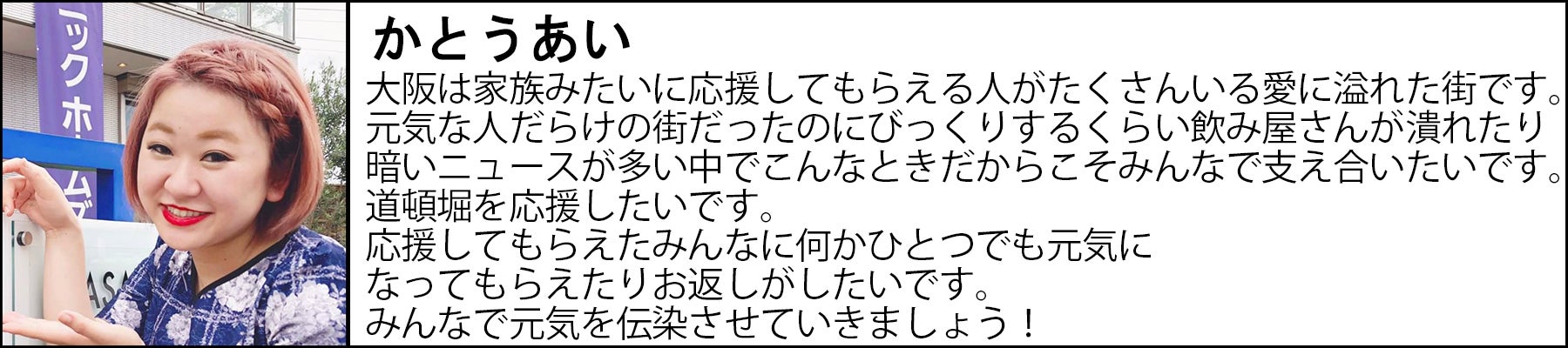 コロナに苦しめられる道頓堀がコロナに打ち勝ち、元の賑わいを求めて挑戦しようとする姿から一人でも多くの方が希望を見出して頂けたら嬉しいです。一丸となってイベントを成功させて下さい!