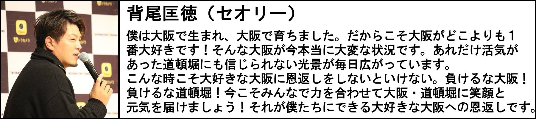 今回のイベントを通して、道頓堀にお客さんが少しでも戻ってきてくださって、道頓堀の活気を取り戻したいと考えています。道頓堀から大阪を元気にしたい。その希望を今回のイベントに込めて、イベントを成功させたいと考えております。