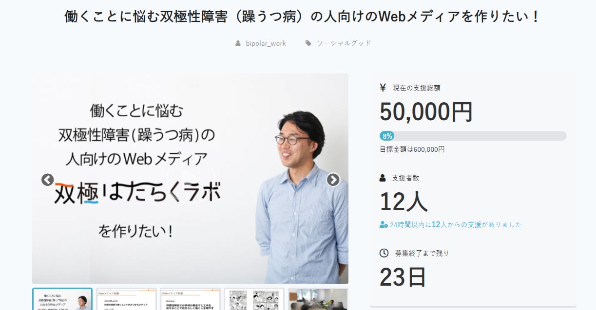 こんにちは。双極はたらくラボ編集長の松浦です。金曜日の夜投稿ですが、今週みなさんはいかがお過ごしでしたか?私は何ヶ月かぶりの怒涛の一週間でした。入念に準備したクラウドファンディングを大々的に開始し、有り難いこと多くの支援をいただき、応援コメントに目を通し、SNSで発信し、活動報告も作成して、とやっていたらあっという間の一週間。イレギュラー業務や外部の刺激が多いと簡単に軽躁状態になってしまうのが私です。なので、今日は活動報告は簡単にして、土日もゆっくり過ごして来週に備えたいと思います。みなさんも一週間の疲れを癒やして、自分自身をいたわってあげてくださいね。それでは引き続き、宜しくおねがいします!