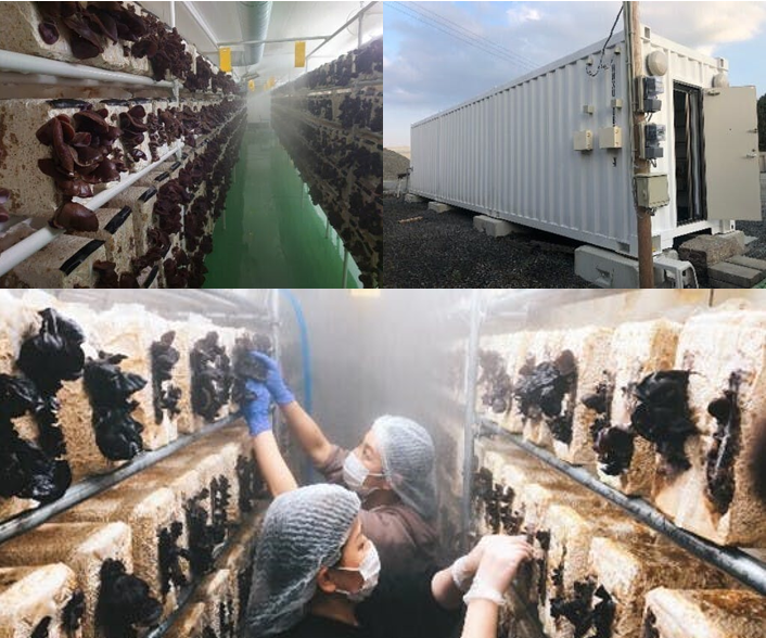 夏のキノコであるきくらげを通年で栽培・出荷するため、温度差や異常気象などの影響を受けない完全閉鎖型植物工場(コンテナ )での栽培を行っています。施設内で「温度、湿度、水分、二酸化炭素濃度」などの育成環境の制御とモニタリングを行うことで生育のコントロール、安定した品質のきくらげを生産しています。