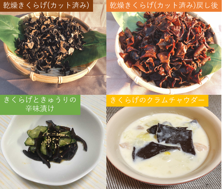 リターンとして、「生きくらげ」「乾燥きくらげ 」「きくらげ の収穫体験」をお届けします。