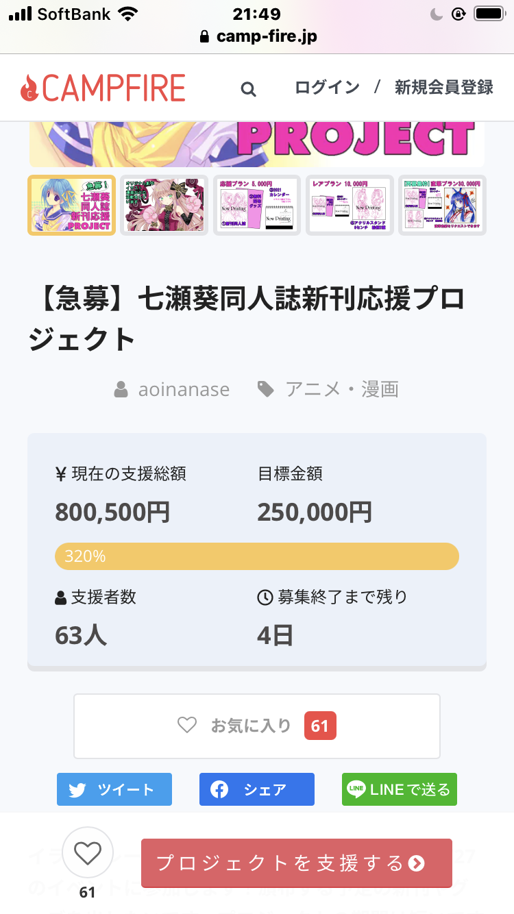 こんばんは、七瀬葵ですなんと¥800.000達成いたしました!ご支援ありがとうございます!そこでストレッチゴール100万達成で支援者様全員に限定のシークレットアイテムを追加でリターンしようかと思っていますプロジェクトの更新を申請しますのでしばらくお待ちください残り4日ほどですがどうかよろしくお願いいたします!