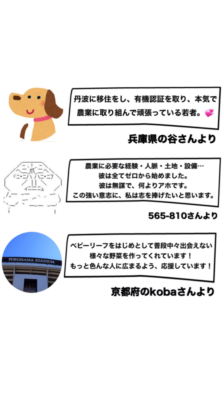 2021/05/19 06:41みなさんおはようございます!直接ご支援いただいた方を合わせると、のべ200名の方にご支援しただきました。びっくりです!うれしいです!ありがとうございました!!クラウドファンディングが金曜日に終わり、次の日の土曜日は神戸へ野菜販売に行きました。家に帰ってきたら緊張の糸が切れたというか、気が抜けまして、クタクタになり、スマホで文字を打つ気が起こりませんでした。笑今振り返るとクラウドファンディングの終盤はずっと興奮状態だったので、その反動がきたんだと思います。笑火曜日になってようやく文字を打つ気が湧いてきたので打ってます。笑(昨日の夜にこの文章を書いてます)遅くなりましたが、これからお礼のお手紙、お電話させていただきます。そして、リターンをしっかり送っていきますー!!!!!書いてたらやる気出てきました!笑支援者の方々のお名前を確認することができまして、地元のお友達、丹波太郎のお客様、学校の先輩後輩など、まさか支援していただいてたとは!!となった方が多数います。支援いただいてたのにも関わらず、気づかずお会いしたときにお礼を言えず申し訳ございませんでした。これからビニールハウス編、リターン編を書いていきます。しばらくみなさまお付き合いくださいませ。ではでは〜。 もっと見る