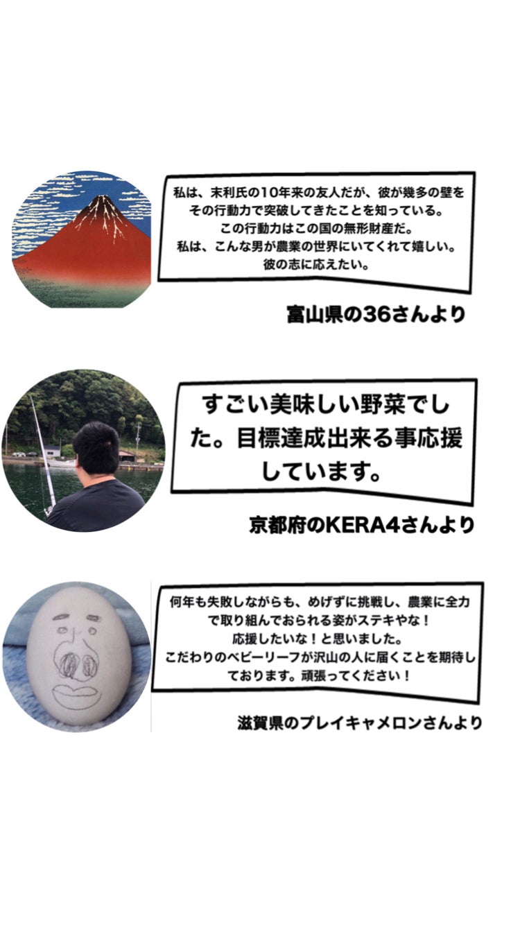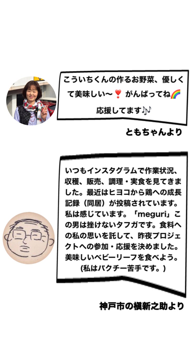 いつもインスタグラムで作業状況、収穫、販売、調理・実食を見てきました。最近はヒヨコから鶏への成長記録(同居)が投稿されています。 私は感じています。「meguri」この男は挫けないタフガです。食料への私の思いを託して、昨夜プロジェクトへの参加・応援を決めました。美味しいベビーリーフを食べよう。(私はパクチー苦手です。) (神戸市在住:IWAMOTO) 槇新之助