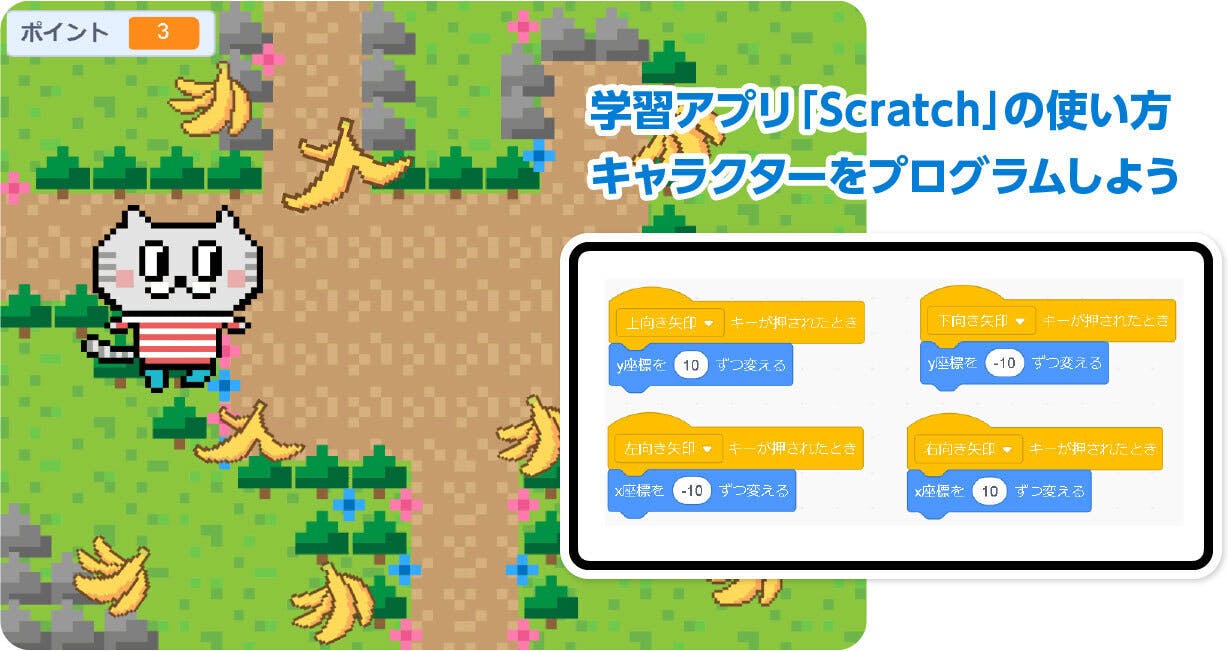 世界中 の小学生~大学生の授業で使われている「プログラミング初学者向け」のオンライン学習アプリ「Scratch」(スクラッチ) を使います。