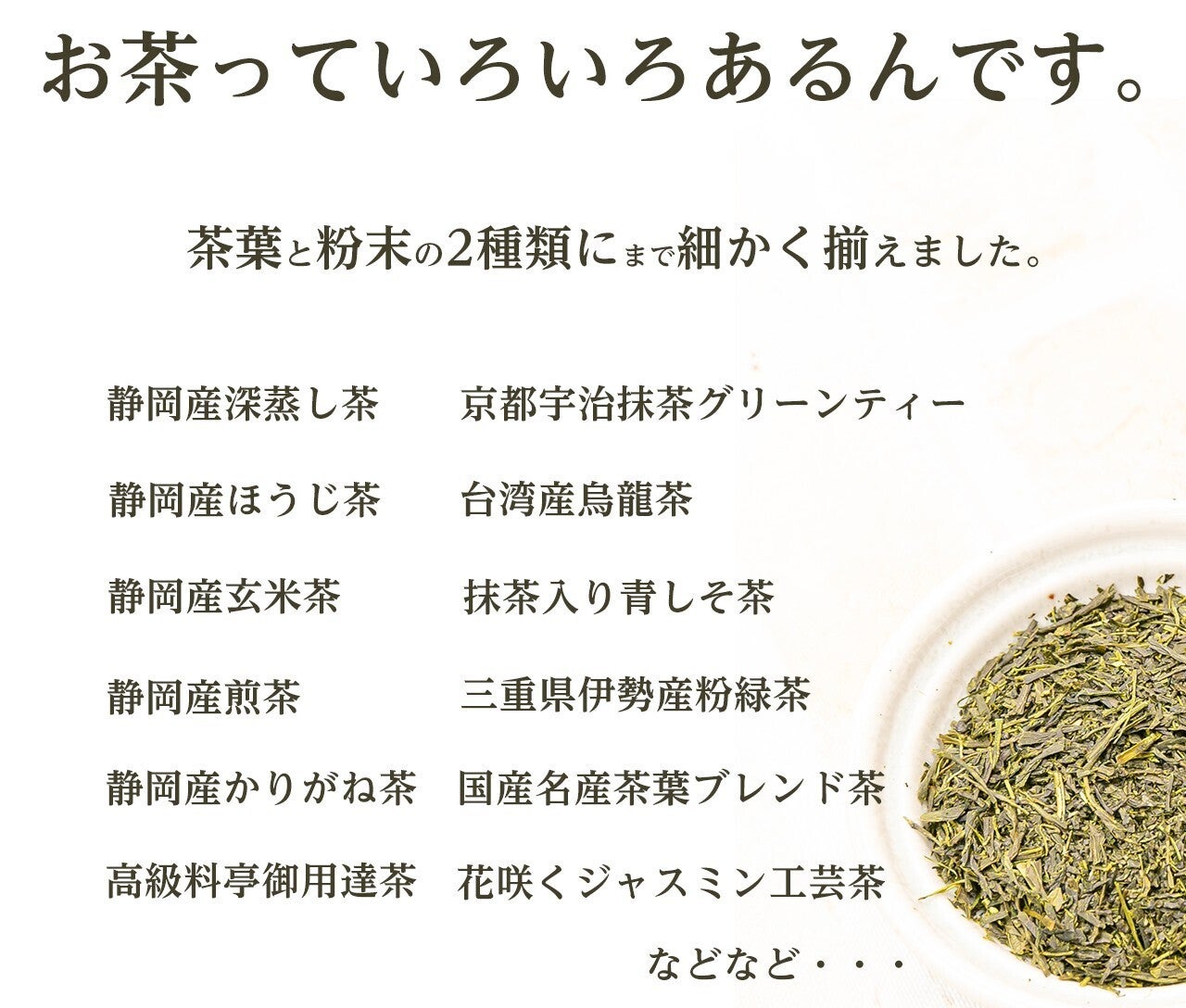 弊社のお茶は、茶葉・粉末がありお茶の名産地である静岡産や八女産を中心に多くの日本茶を取り扱っています。