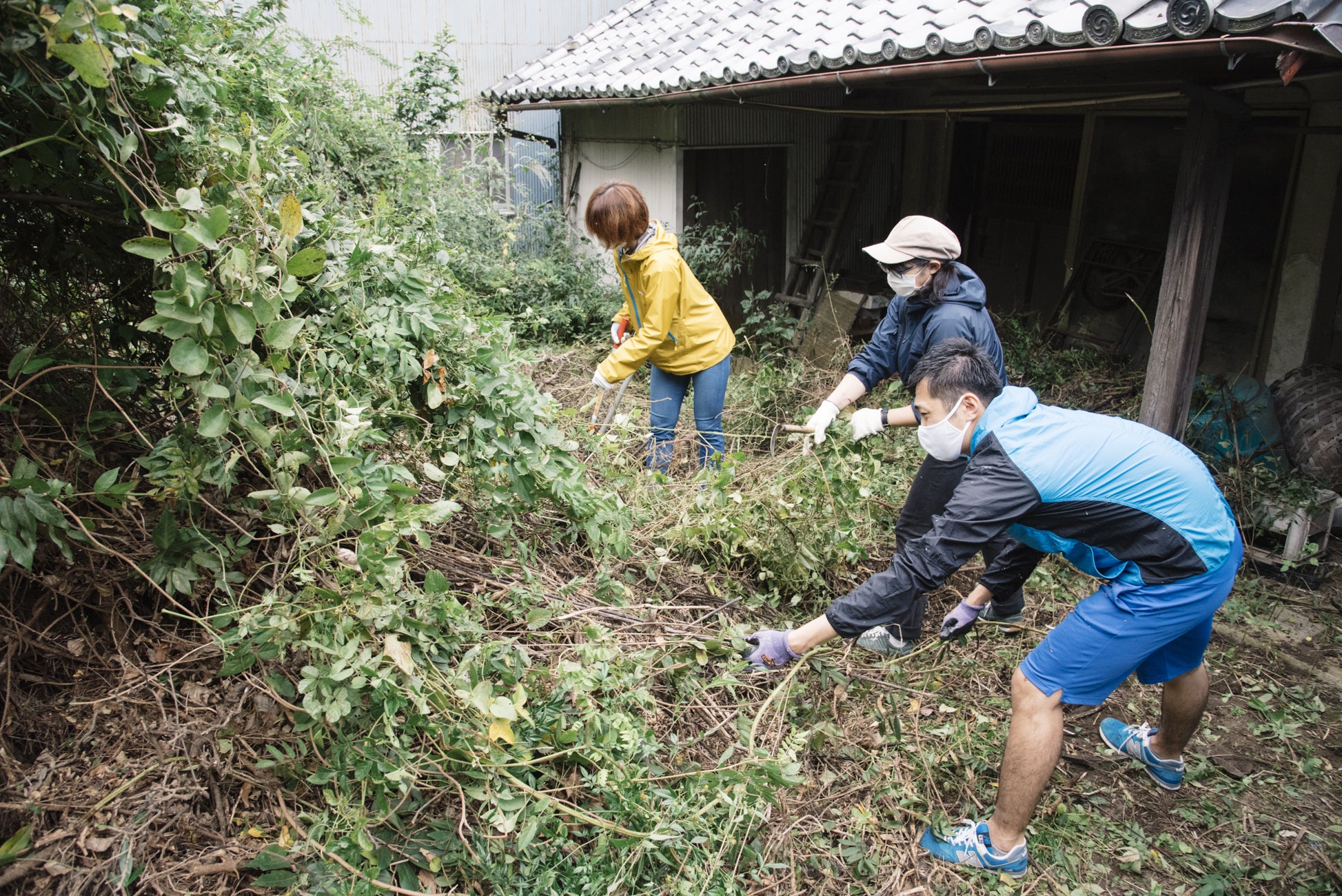 庭の雑草を力を合わせて抜く