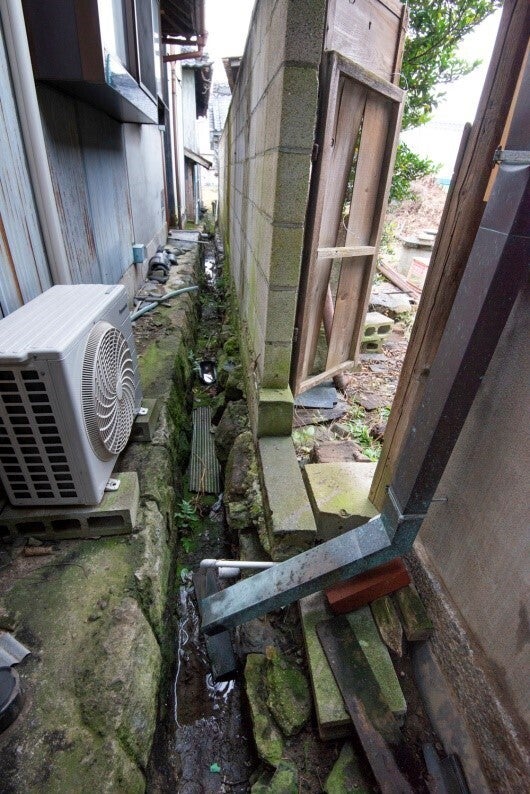 上水は敷地南側から隣家との境の側溝の中を20mほど通って北側の母屋まで配管されており、露出している部分もあるため何度も凍結による破裂を繰り返しています。また側溝の底に溜まった土の中を通っているため衛生的ではありません。