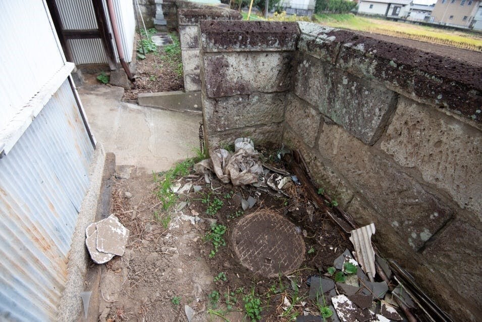 既存のトイレは単独処理浄化槽につながっていますが、古い方式であることに加え、老朽化のため現在は全く機能していないことが10月の調査で初めてわかりました。加えて、南側道路に隣接する敷地内に、公共の下水道工事が行われた際に引き込まれたと考えられる排水桝が土中深く埋まっているのが見つかりました。