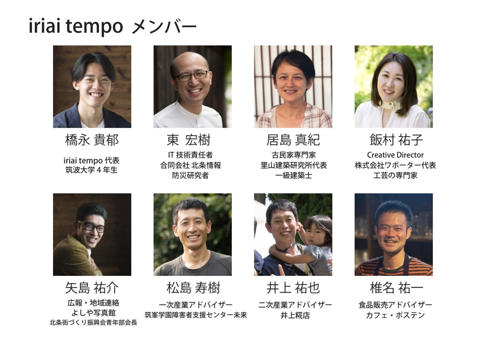 合同会社iriai tempoはまちづくり活動を行う青年部会メンバーを中心に、地元北条で農業、食品製造、カフェ、工芸、建築、IT、写真の仕事を行う7名と、代表である大学生の計8名で設立しました。