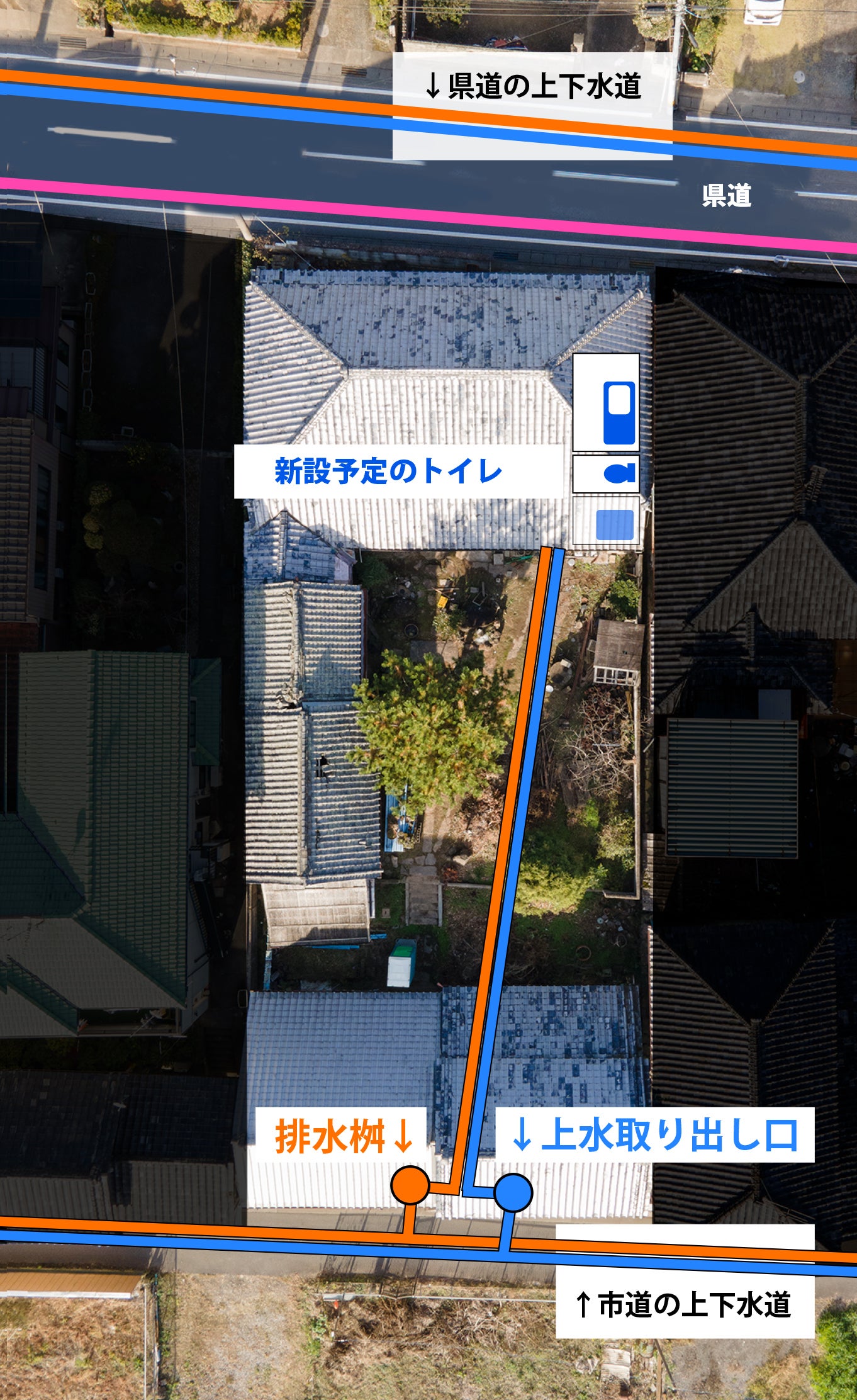 ①母屋に近い北側の県道を通っている管に接続し直す