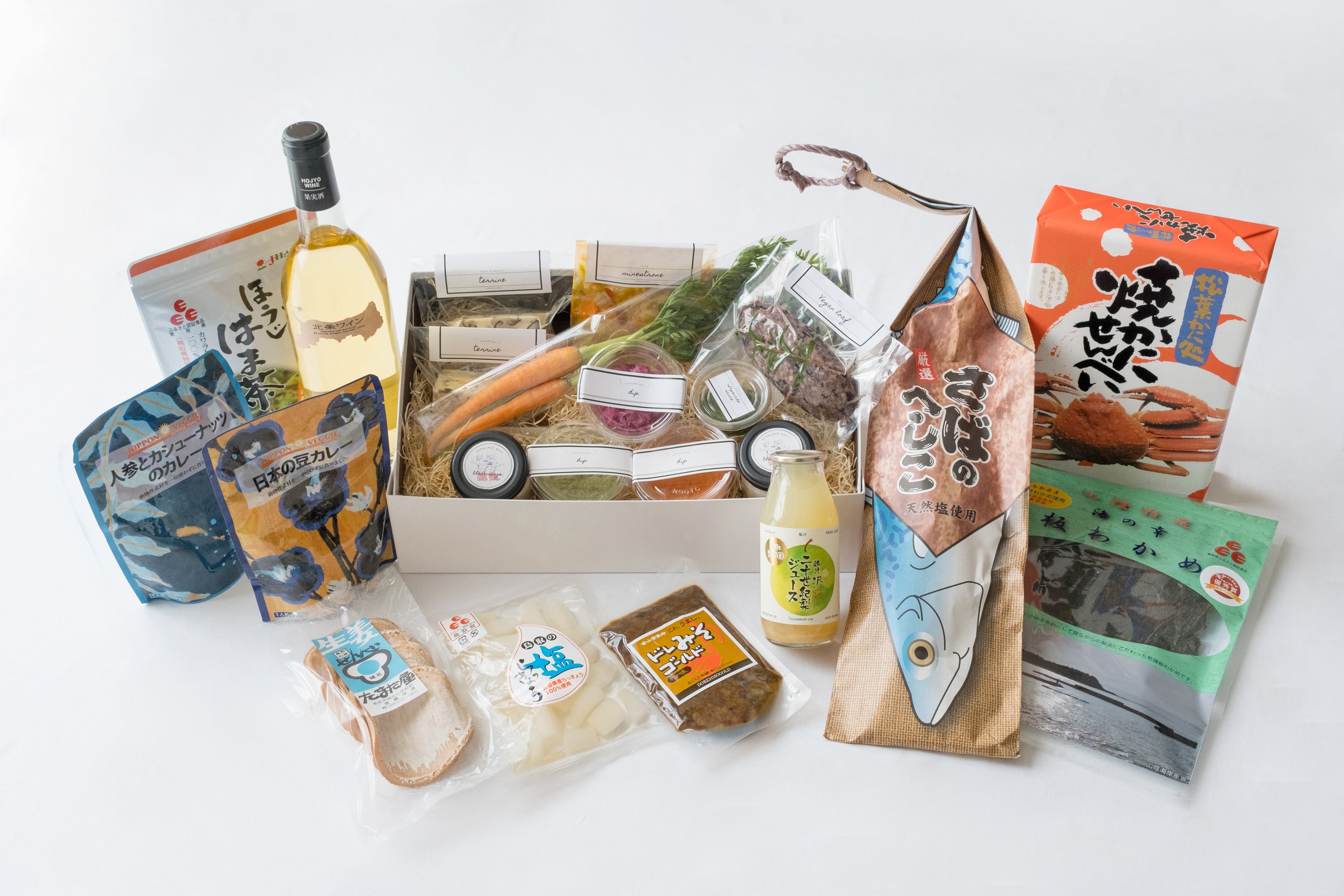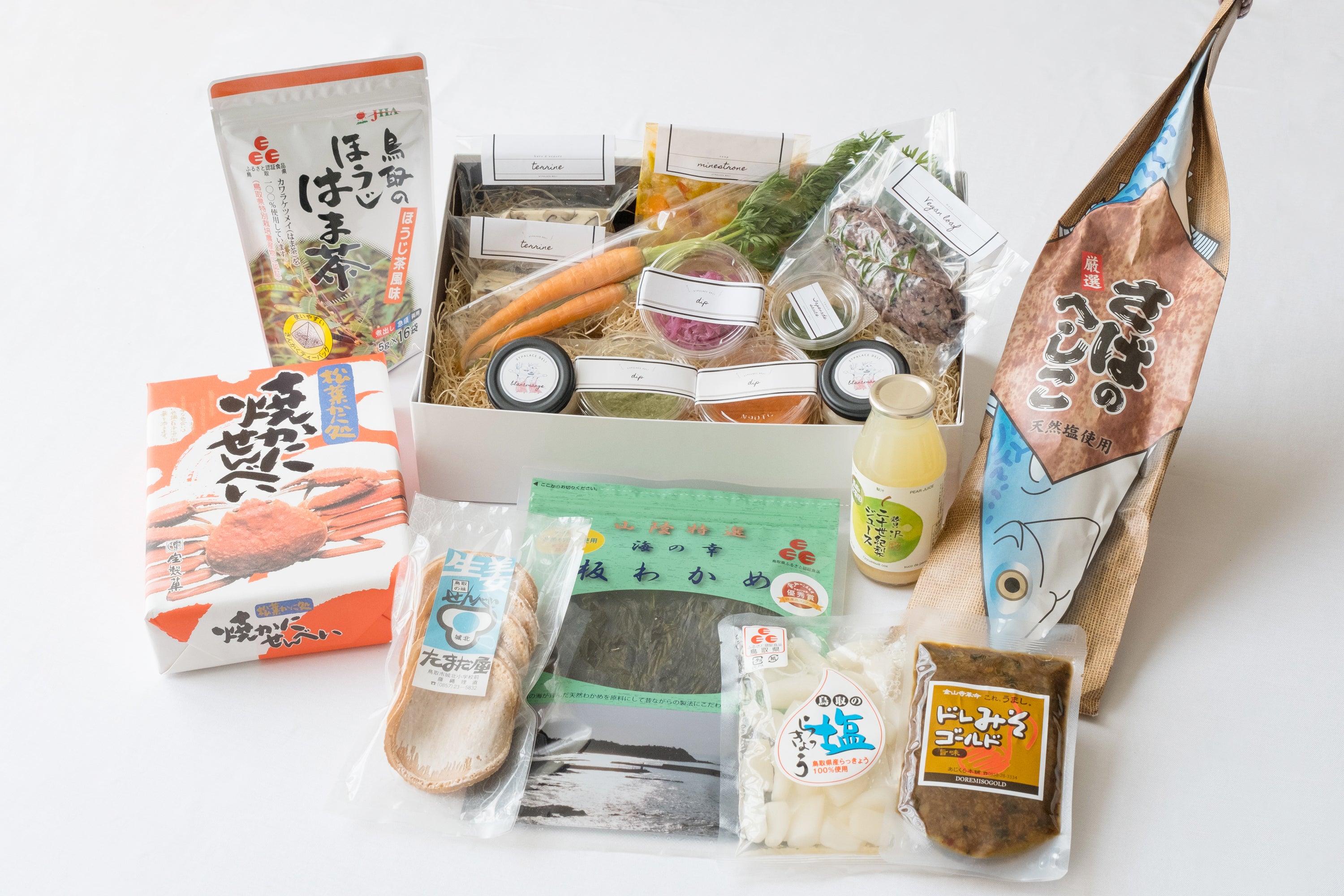 ヴィーガンフルコースに加えて、当グループのお土産品店で販売している鳥取のお土産品からカノウさんに独自にセレクトしていただいたものをセットにしたものをまとめてご用意いたします。