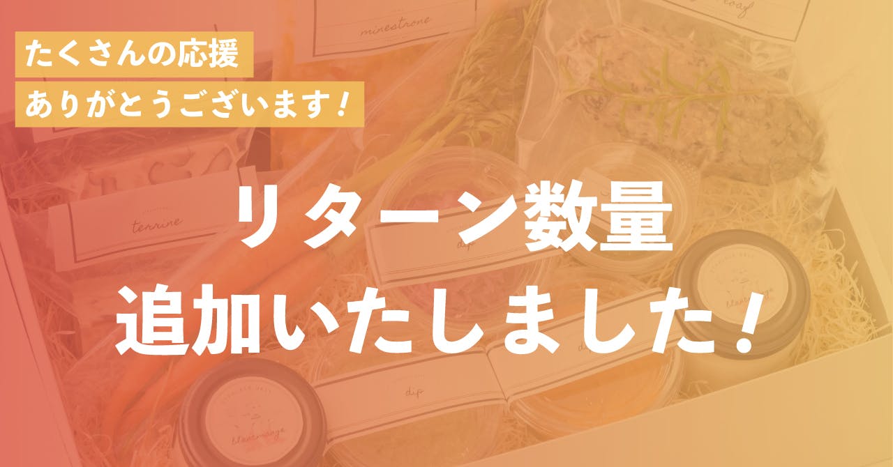 皆様のおかげさまで、当初ご用意させていただいておりましたリターン数量を超えるお問い合わせをいただき、売り切れになっているリターンが多くなりましたので、生産体制を強化し、追加のリターン数量をご用意させていただきました。
