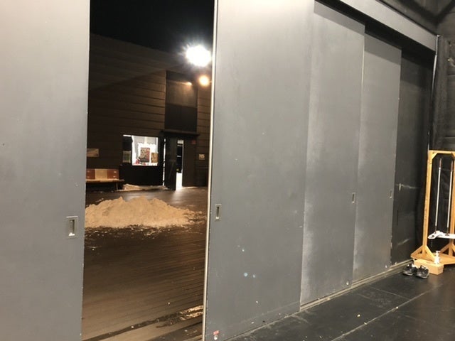稽古場の10-BOXのウッドデッキでは、雪かきで集められた雪の塊がまだ山になってます。