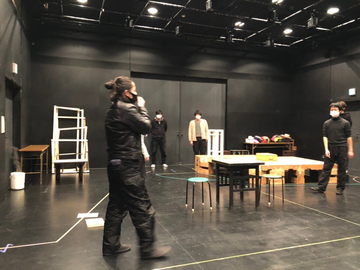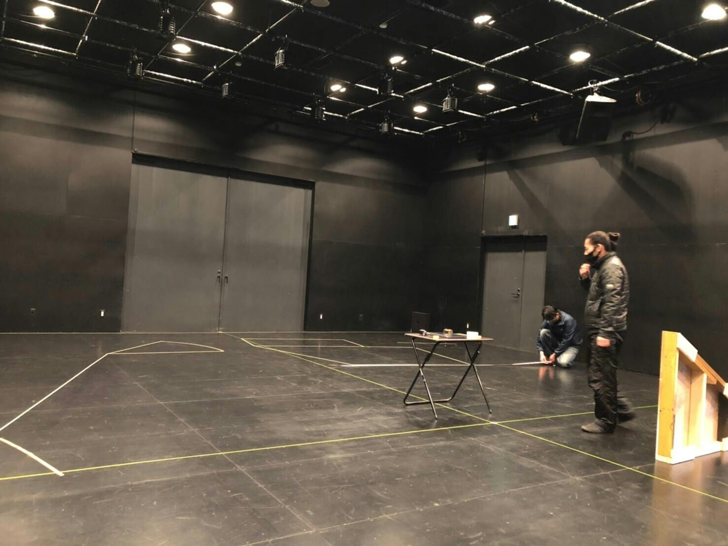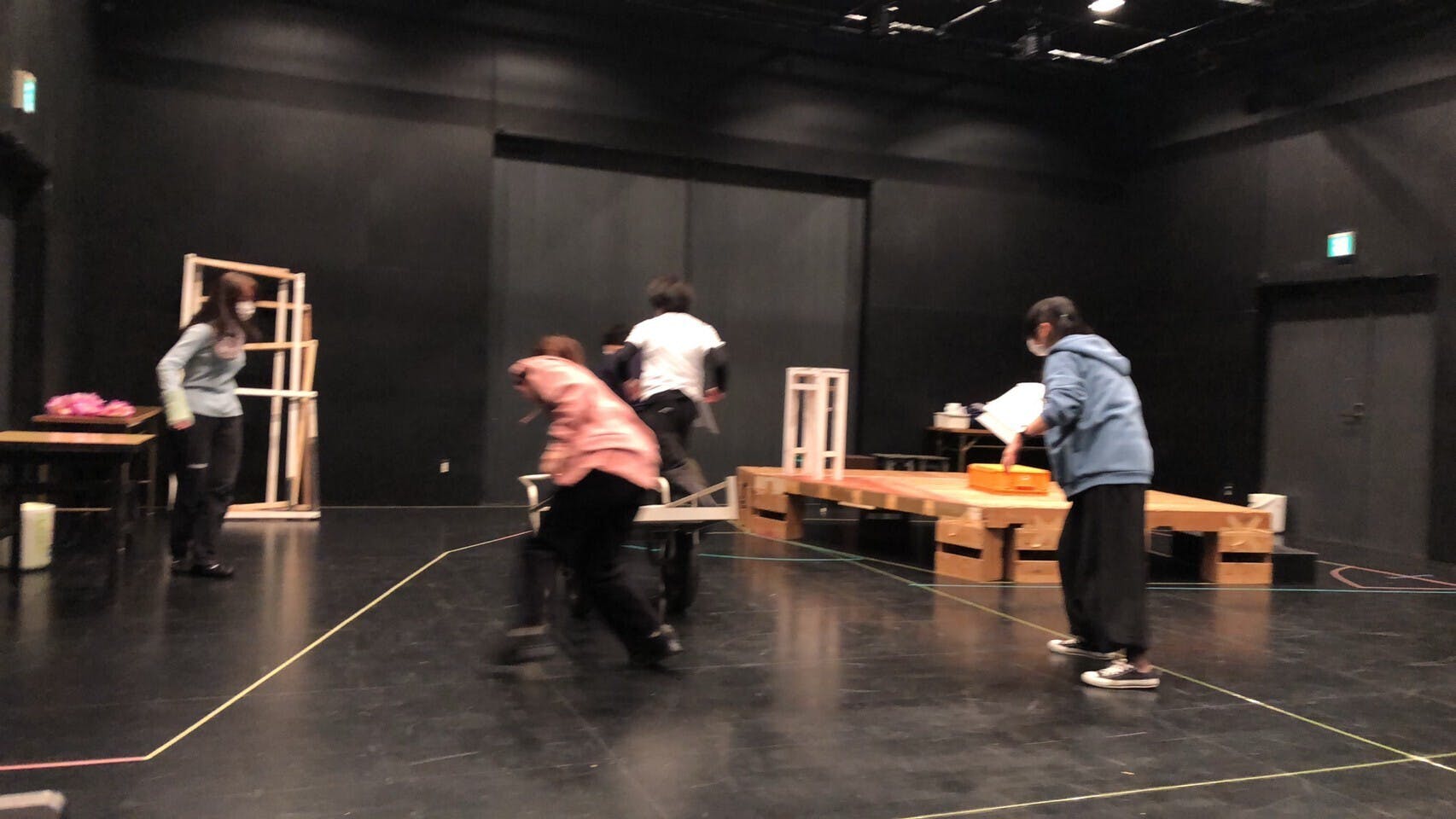 本日は、公演で使用するbox-1での稽古に、舞台スタッフが実際に舞台を立て込むところを場ミリ(※1)、段差のあるセット部分を仮組してくれました。