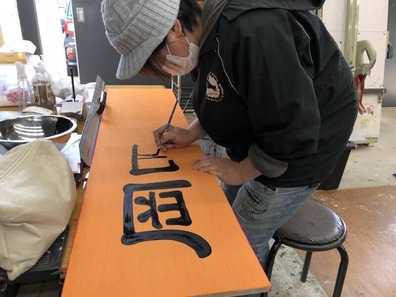 写真は「岡田劇場」の看板づくりをする高橋舞さん。今回の芝居はいつにも増して小道具がたくさん。愛情たっぷりの小道具たちが作品を彩ってくれています。本番をどうぞ楽しみにしていてくださいね。
