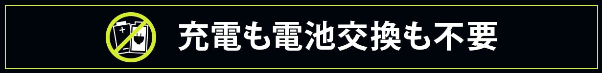 バッテリーは不要!高い電池を買い替える必要もなければ、面倒な充電も必要もありません。そのため維持コストはゼロ。使いたいときに取り付けるだけ。付けっぱなしだってOKです。電池の廃棄もなく環境にもやさしいライトです。