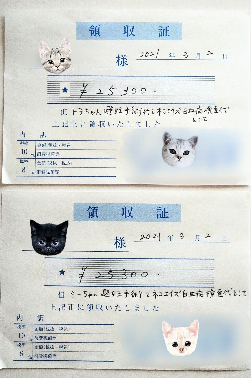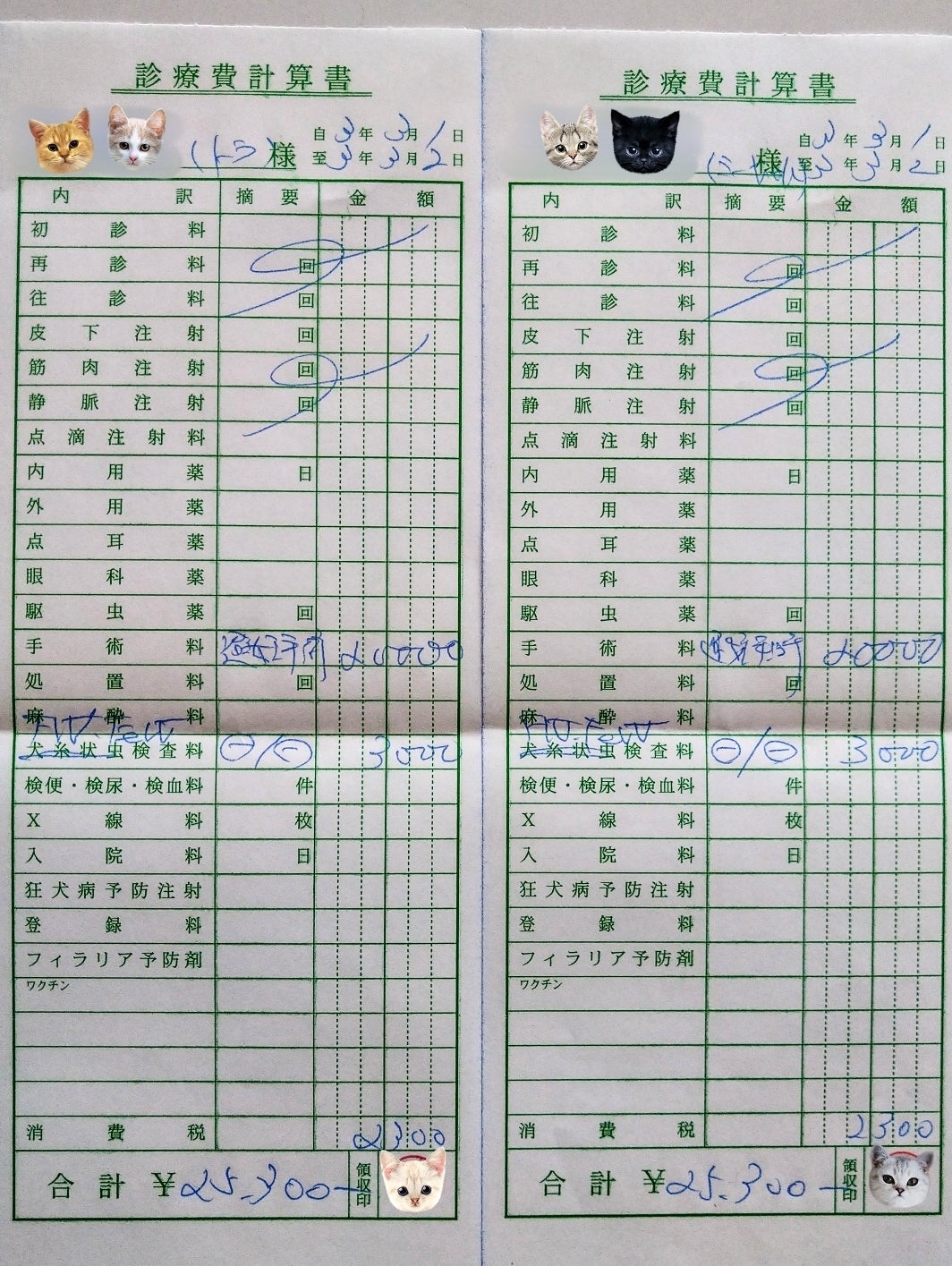 明細を載せるのをずっと忘れていてすみませんでした(汗)母猫ちゃん達の手術、感染症検査の時のものです。