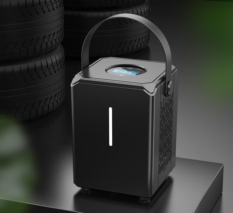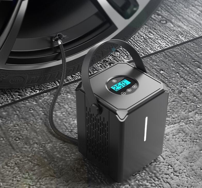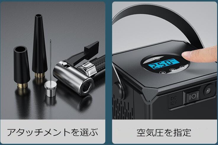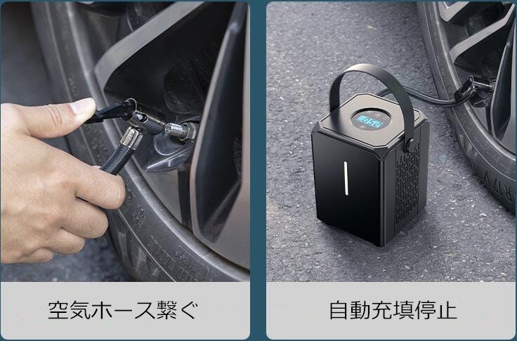 ●内蔵バッテリーとシガーソケットによる給電の2パータンで稼働することができ、場所を選ばず、どこ・いつでも空気充填できます。