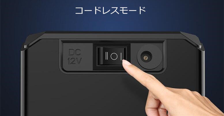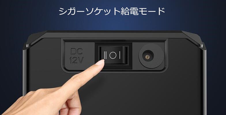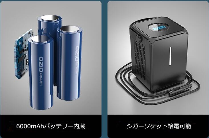 本製品は内蔵の6000mAhバッテリーとシガーソケットによる給電の2パータンで稼働することができます。