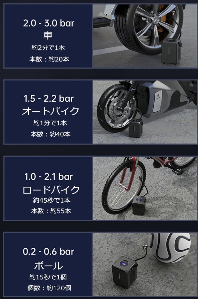 ●6000mAHバッテリーを内蔵しておりフル充電の場合は約20本の自動車空きタイヤ、約40本のオートバイクタイヤ、約55本のロードバイクのタイヤに空気充填できます。