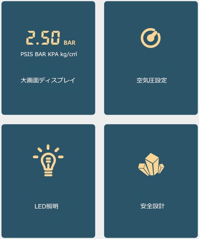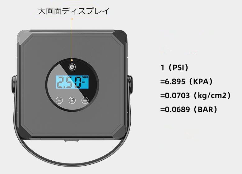 ●LCDデジタル空気圧メーターが装備されて、液晶画面で空気圧単位、バッテリー残量、指定空気圧の値をはっきり反映できます,夜間でも数字が見やすく,安全に空気入れが可能です。