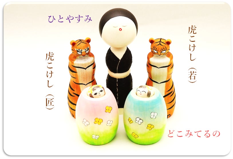「虎こけし」を紹介します。ミアウペッケに似ているかもしれませんが、虎です。同じ猫族ですから、そこは大きな心持ちで見守っていただきたい。 オマージュした作品の「伊年印 虎図」は400年前の作品なので作者の俵屋宗達さんが本物の虎を見たとは思えず、中国の屏風図から空想した想像図であろうと思います。これを見た時に、どうにもこうにも私には、虎が面白そうなものを見つけたようにしか思えませんでした。いたずら好きの子虎のようにも見えます。 現在では、動物園で虎を見れますし、写真などから写実して描くことはできます。でも、このかわいい感じは琳派と言われる画家たちが私淑して、歴々と新たな絵画にして引き継いでいってます。なので、新型こけしでやってみようと思いました。 伝統こけしは直接師匠から伝統の技法を教わりますが、新型こけしに決められたしきたりはありません。なので、勝手に真似して勝ってに模写して自由に楽しくこの作品を作りました。自信をもって私淑してると言えるように、琳派をもっと研究していきたいと思います。 絵画の専門家からすれば、平面の絵を立体に変えて描くのがこけしなので、あまり現実的ではないと言われるやもしれません。自分勝手にひとときの幻想をみるだけになるやもしれません。それでもやめられなくなりました。だから、こけしは面白いのかもしれません。 俵屋宗達の虎は大きな足が今にも踏み出そうとしているかのようです。でも、かわいいことに爪は引っ込めているし、しっぽは丸めてしまっているようです。虎こけしはこけしだからいずれにしましても出せないままです。誰か助けてあげてください。感染病パンデミックのおかげで「ひとやすみ」もしていられないし、「どこをみてるの」かもわからない。せめて話を聞かろよって言いたげです。 400歳の長老虎「そうた」は、濃い眉をひそめ、体の紋様はすこし太めになり、しっぽがともかく長いのが特徴です。 まだまだ若い虎「ソータ」は、丸くつぶらなひとみ、体の紋様には精悍なフレッシュさが漂い、しっぽは上品な長さなのが特徴です。 二人に共通しているのは、大きくへの字にした口と、ぎゅっと指を握った足と、あたまの模様です。偶然にも匠とのコラボレーションから巡りあうことができた2体の虎こけしです。 今年だけの限定品となりましょう。次は12年後なのでまた作れるかはわかりません。100年後に私淑して作る人が現れるやもしれません。またもや現実から幻想の世界へと飛んでしまいました。功 Selection 「ひとやすみ」 を紹介します。 見せてもらった工房の215体の作品から選びました。新型こけしではなく創作こけしといいたいところです。手間暇がかかるからあまり作りたくはないと佐々木功工人からは言われました。でも、今の世界情勢から、ひとやすみしたいと強く願う人達に届けられればと思い無理にお願いをしました。 特徴は顔の表情に限らず、頭髪のまげ、着物(服)にあります。着物の色は写真では黒いように見えますが、紫が混じった濃いこげ茶色です。しかもこの着物は和紙です。胴体に巻き付けてあり適度にしわが寄っています。実物を見ていただたらその出来栄えに驚かれるだろうと思っています。ささやかながらも新鮮なアート感を味わえるのが新型こけしの魅力です。美穂 Selection 「どこみてるの」 を紹介します。 伝統こけしの特徴ある形状を【たちこ】【えじこ】と呼ぶことがあります。この新型こけしからは、えじこに創意工夫をした雰囲気が感じとれます。えじことは藁を編んだ籠のことで、赤ん坊を入れて農作業をしていました。えじこの中に小さなこけしをすっぽりと入れる技を磨くことは、こけし工人の修業のひとつとされているようです。 特徴はそのごくごく小さな頭。この小さく丸い形に描く表情は、大きな形に描くよりとても神経を使います。1mmのずれも許されなくなるからです。その巧みさのなかから生み出された豊かな心温まる表情に思いを寄せていただれば嬉しいです。みなさんはどこを見ますか?モンシロチョウにもモンキチョウにも一筆書きとは違って丁寧な描写がありますよ。もっとご紹介したいところが山ほどあります。このほかのSelection品についても今後活動報告で紹介していきたいと思います。 そして小さいながらも展示会を開き、ひとりでも多くの人に現物を見てもらえるようにしていきたいと思っています。1月22日~23日で行います。今回は「ミアウペッケ」の誕生物語を紹介する予定です。場所は宮城県大河原町の「うらにわあとりえ」、来ていただけると嬉しいです。https://uraniwaatelier.com/