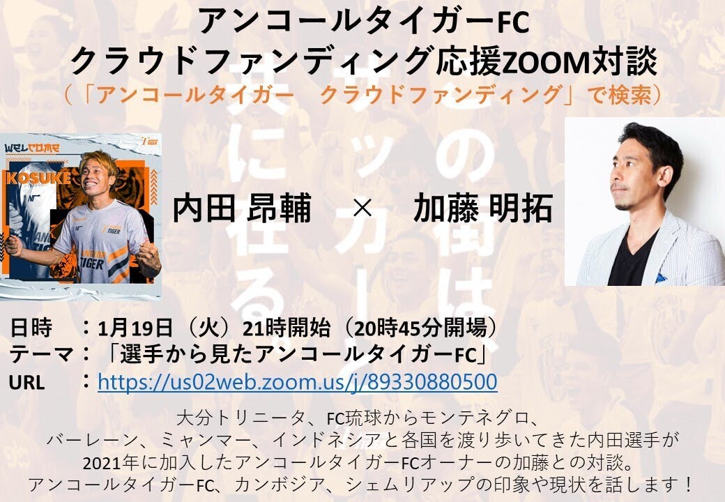 2021/01/19 11:12本日、日本時間21時より「オーナー加藤 × 新加入内田選手」の対談をオンラインにて開催します。日本人選手から見たカンボジア、シェムリアップ、アンコールタイガーFCはどのように見えているのか、オーナー加藤との対談を通して皆様にお届けできればと思います。お時間のある方は是非ご参加ください!※参加無料【日時】2021年1月19日(火)21時〜(20時45分開場)質疑応答含め1時間程度を予定しております。【Zoom URL】時間になったら下記リンクから入場ください。https://us02web.zoom.us/j/89330880500 もっと見る【支援者様限定公開】目標達成しました!皆様、ご協力ありがとうございました!
