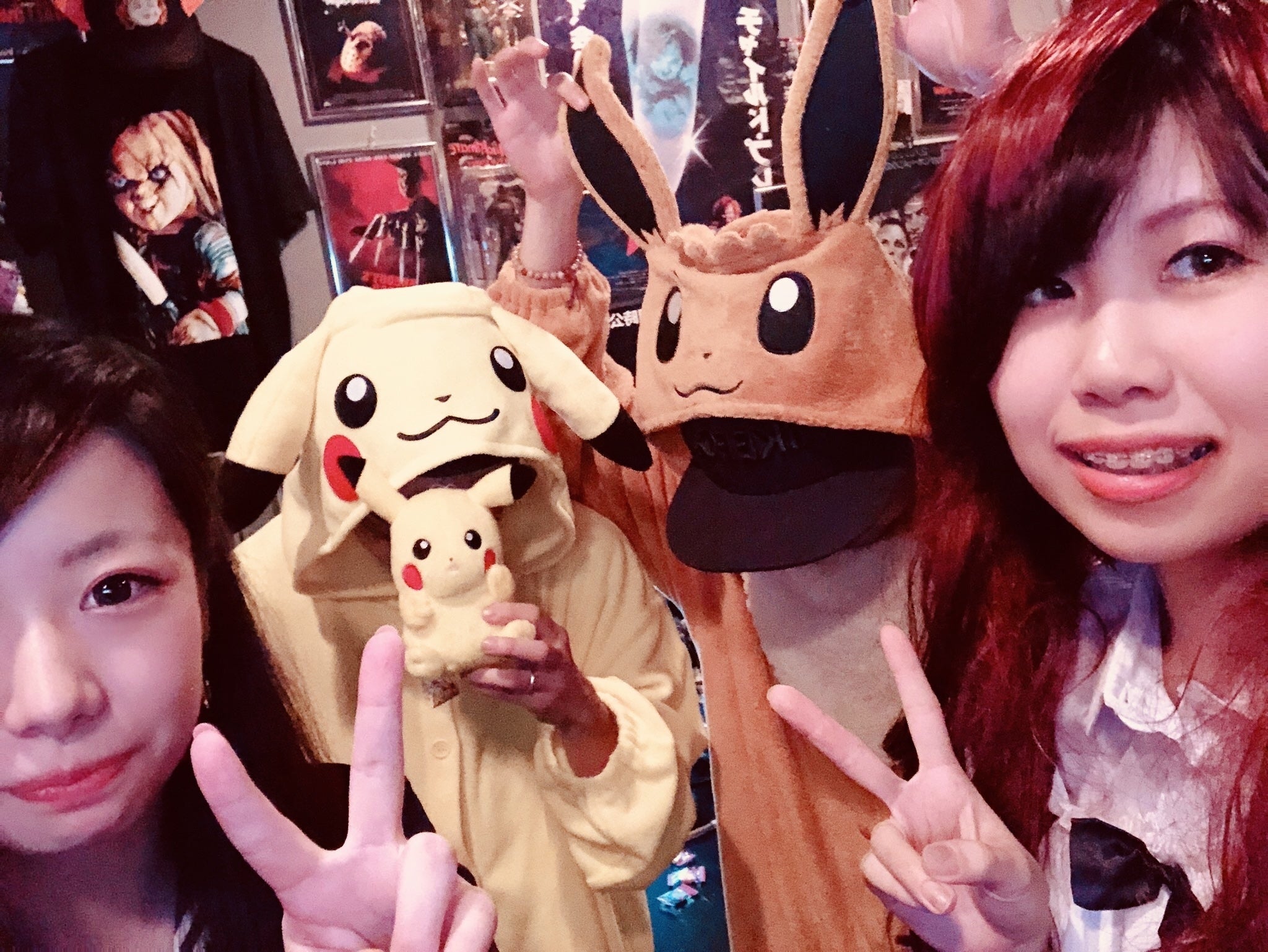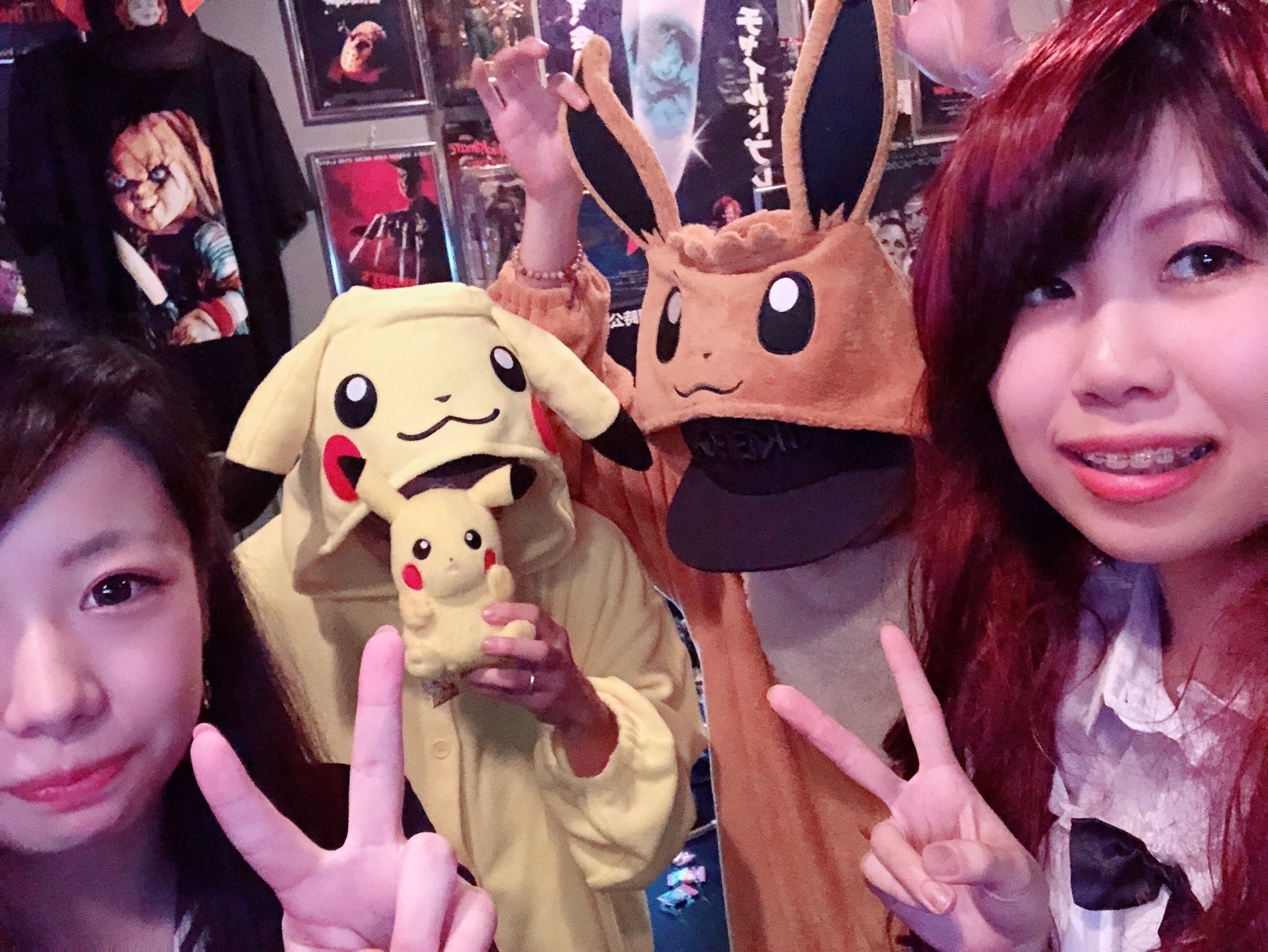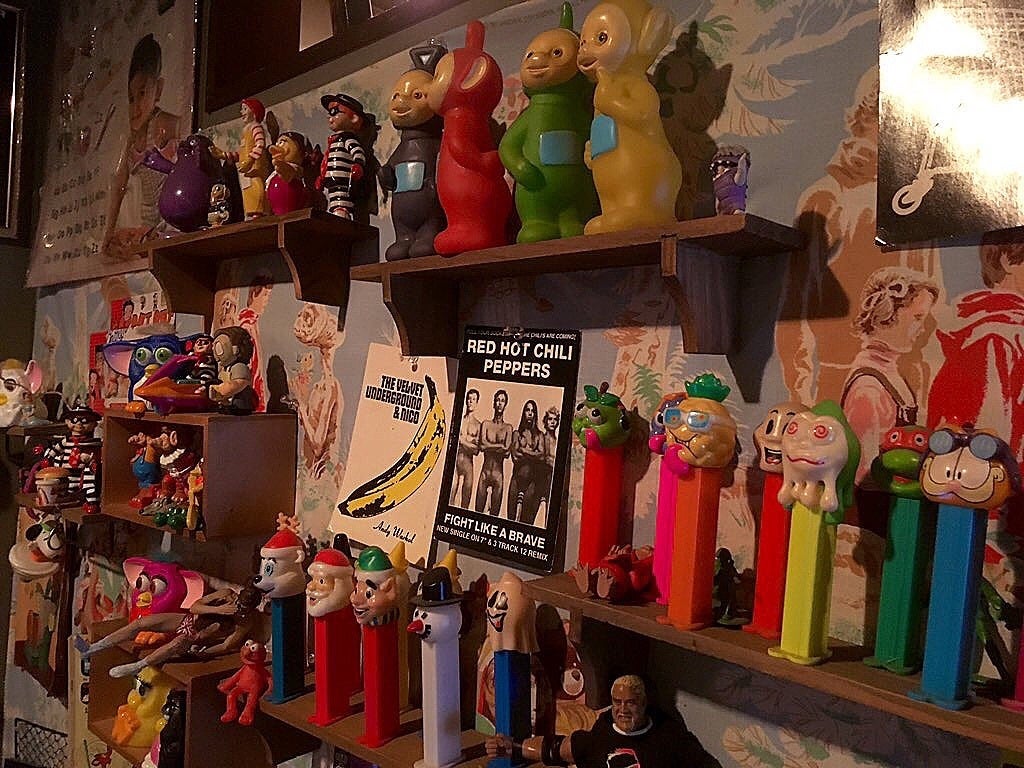 店内はホラー映画のポスターやアメトイのグッズで囲まれています。